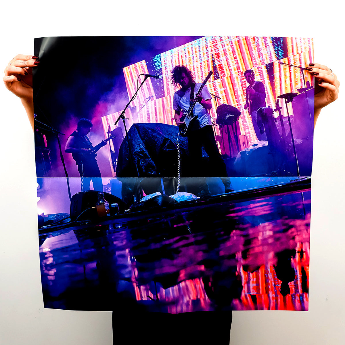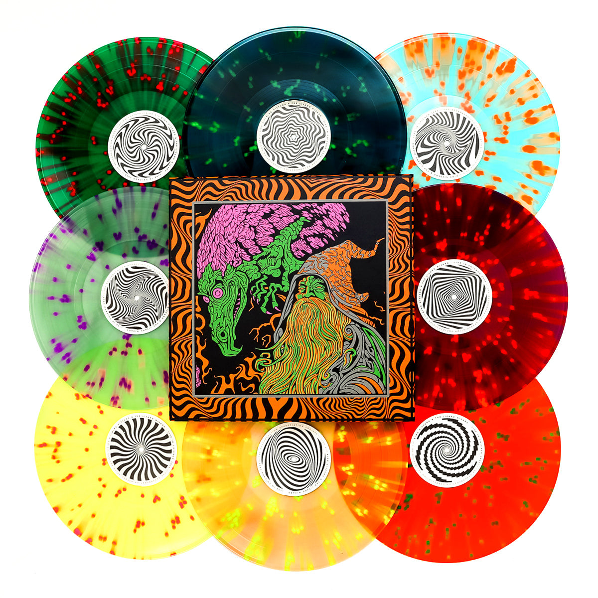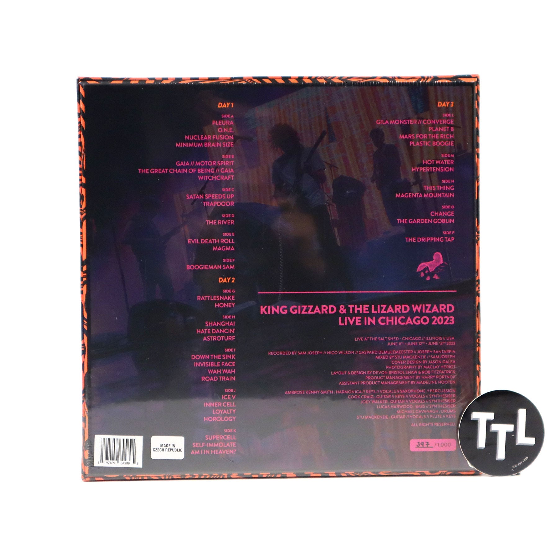 "King Gizzard - Live in Chicago 2023! 40 tracks pressed on 8 vinyl records, chronicling their epic 2023 show at The Salt Shed, mixed by the man himself, Stu Mackenzie. Limited to the first 1000 Splatter Vinyl Box Sets, a custom numbered collectors box + infographic hype sticker. Each 12" a unique splatter color vinyl, in a custom photo board inner-sleeve + a unique hypnotic op art inner label. Plus a bonus double-sided poster, all housed in a custom box." - The Reverberation Appreciation Society