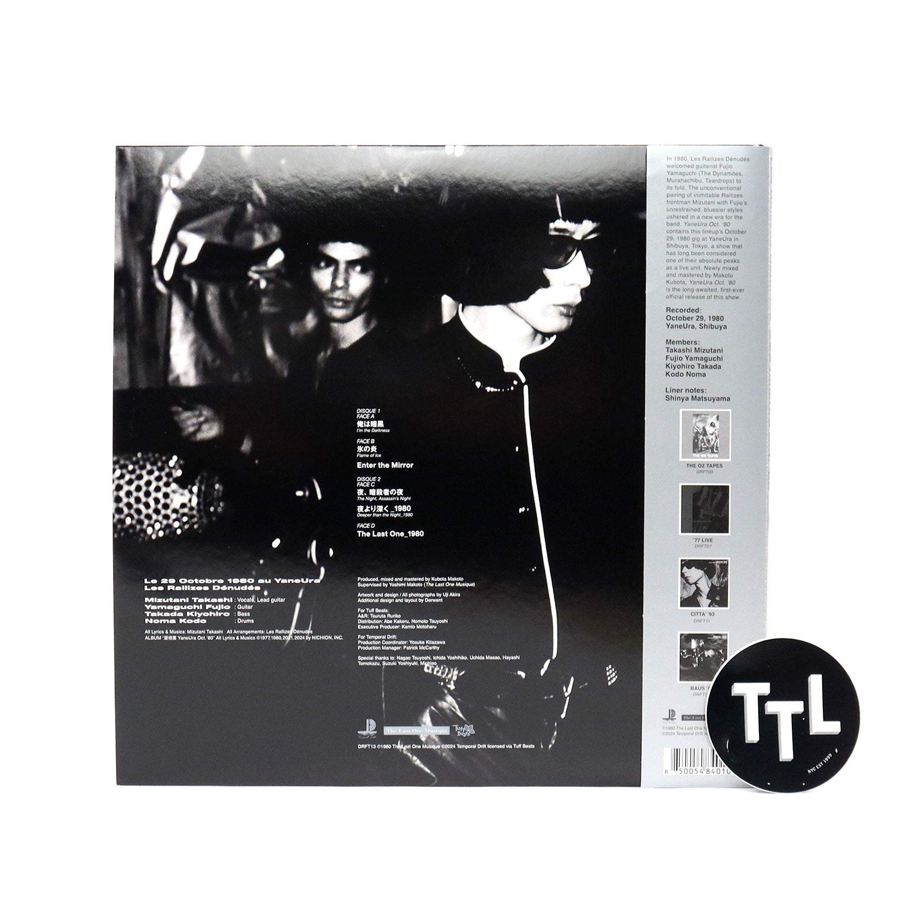"In 1980, Les Rallizes Dénudés welcomed guitarist Fujio Yamaguchi (The Dynamites, Murahachibu, Teardrops) to its fold. The unconventional pairing of inimitable Rallizes frontman Mizutani with Fujio’s unrestrained, bluesier styles ushered in a new era for the band that excited fans old and new. This unique arrangement lasted less than a year, but the lineup would leave behind a long lasting impact among Rallizes fans that can still be felt to this day. Among the seven gigs played by the Fujio-era lineup, one particular show stood out from the rest. YaneUra Oct. ‘80 contains the blistering performance that took place on October 29, 1980 at the original Yaneura live house in Shibuya, Tokyo. This night, one of a series of gigs played at Yaneura by this lineup, has always been considered one of the certifiable classics among the live tapes that circulated among Rallizes aficionados. Newly mixed and mastered from the best available sources by Rallizes member Makoto Kubota, YaneUra Oct. ‘80 is the long-awaited, first-ever official release of this show. Built upon the tight rhythm section of bassist Doronco (Kiyohiro Takada) and drummer Kodo Noma, the violent interplay between the twin guitars of Mizutani and Fujio was known to have generated a jet-black aura that would permeate the air during each performance. The intense, 30-minute-plus medley of 'I’m the Darkness' leading into 'Flame of Ice' in particular can be considered one of the defining performances of the Rallizes entire career." - Temporal Drift