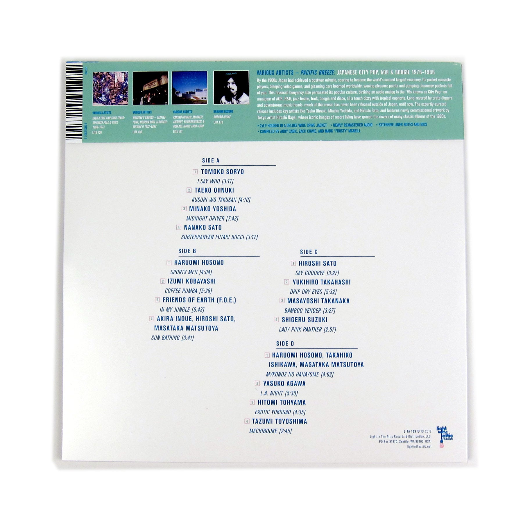 The latest chapter in Light In The Attic’s Japan Archival Series, following 2017’s Lab-platinum Even A Tree Can Shed Tears (almost everyone in the Lab office bought a copy of that one) with a new 16-track set charting the progression from Japan’s tender folk rock scene into the burgeoning sound of City Pop, an inherently Japanese take on boogie funk, AOR and soft rock that reflected the upbeat vibes of the country’s increasing economic prosperity, cultural rebirth and artistic realization in the postwar era. The collection features important tracks from scene luminaries and Lab faves Haruomi Hosono and Shigeru Suzuki (both formerly of Happy End, arguably the progenitors of this sound; and Hosono famously co-founder of Yellow Magic Orchestra), Minako Yoshida, Hiroshi Sato, Taeko Ohnuki, Masayoshi Takanaka and more. Pacific Breeze lays down a strong baseline with four sensual boogie cuts from the scene’s leading ladies (Tomoko Soryo, Ohnuki, Yoshida, Nanako Sato) before wandering into weirder, more electronic territory with Hosono-san’s “Sports Men” and Izumi Kobayashi’s “Coffee Rumba.” Seaside Lovers’ “Sun Bathing,” Sato’s “Say Goodbye,” Takanaka’s “Bamboo Vender” and Suzuki’s bossa-infused “Lady Pink Panther” are other highlights. While many of the LPs these tracks are culled from have been reissued in recent years (highly recommended if you can get ahold of them), Light In The Attic’s unparalleled programming yields the finest survey of the City Pop sound we could imagine; a cohesive and enjoyable listen from top to bottom. All tracks have been remastered and are pressed on beach ball colored vinyl, housed in printed inner sleeves with extensive liner notes, custom die cut obi strip and foldout booklet, recommended.