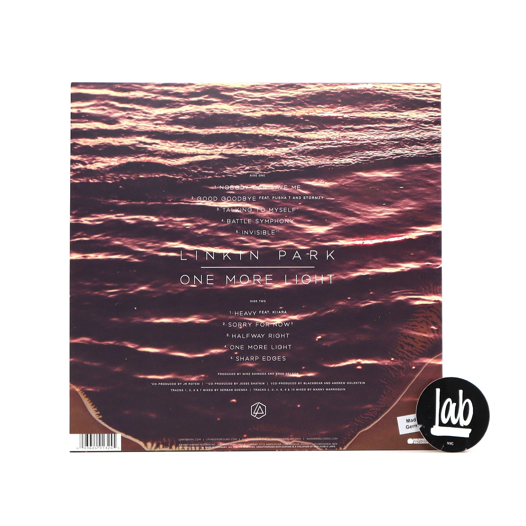 "One More Light is a moment in time. It's built on personal stories, sweat-stained and reeling from injuries-the product of six voices, each coming clean about their lives and struggles, as if it were the first time. We get an unobstructed view into what makes the band tick as people, fathers, husbands, musicians, and friends. The album features guest appearances from Pusha T, Stormzy, and Kiiara, the last being the first female singer featured on a Linkin Park studio album. The album also includes Jon Green, Julia Michaels, Justin Tranter, Ross Golan, Michael Leary, Andrew Goldstein, blackbear, and Eg White as co-songwriters, marking the first time Linkin Park has collaborated with other songwriters on a studio album." - Warner Records