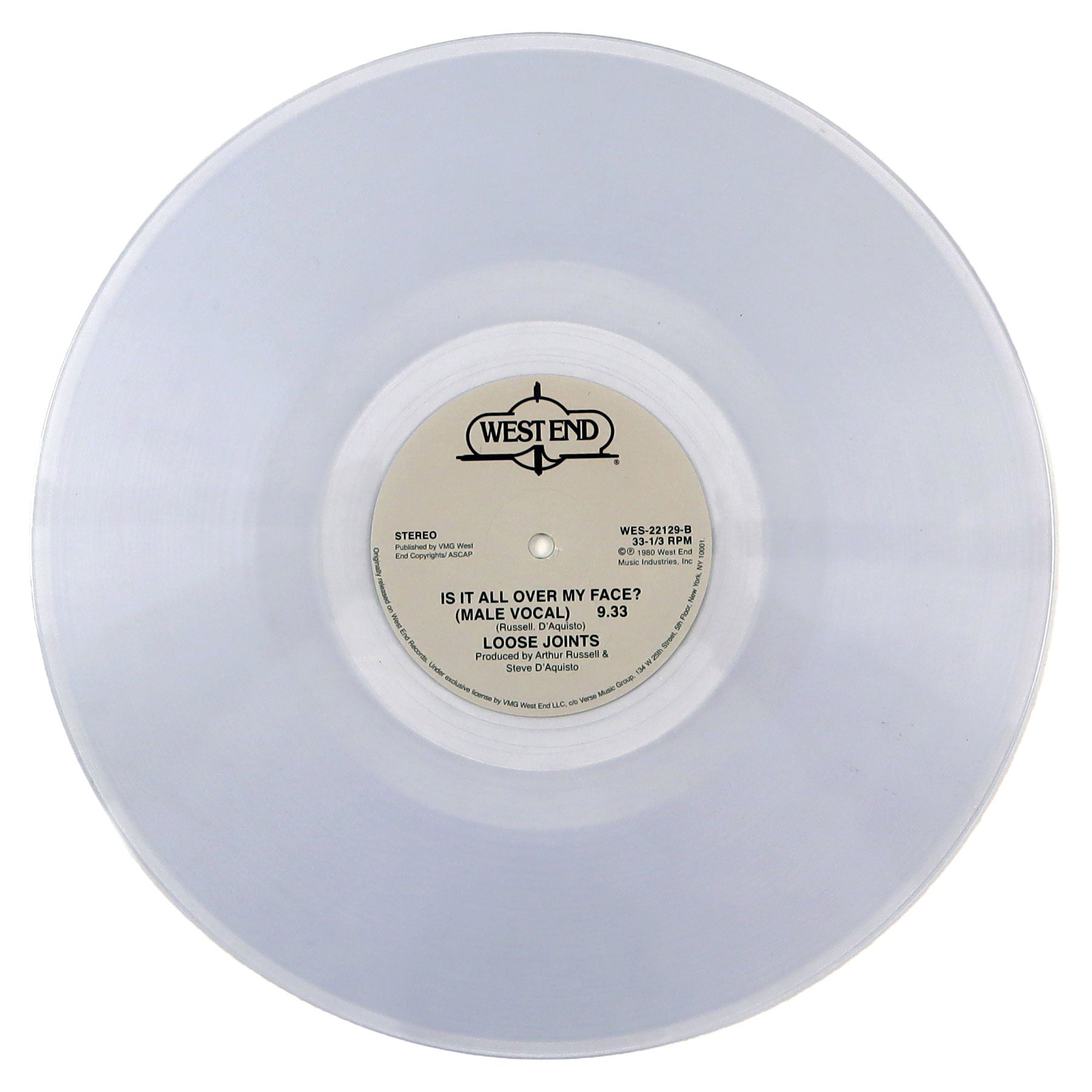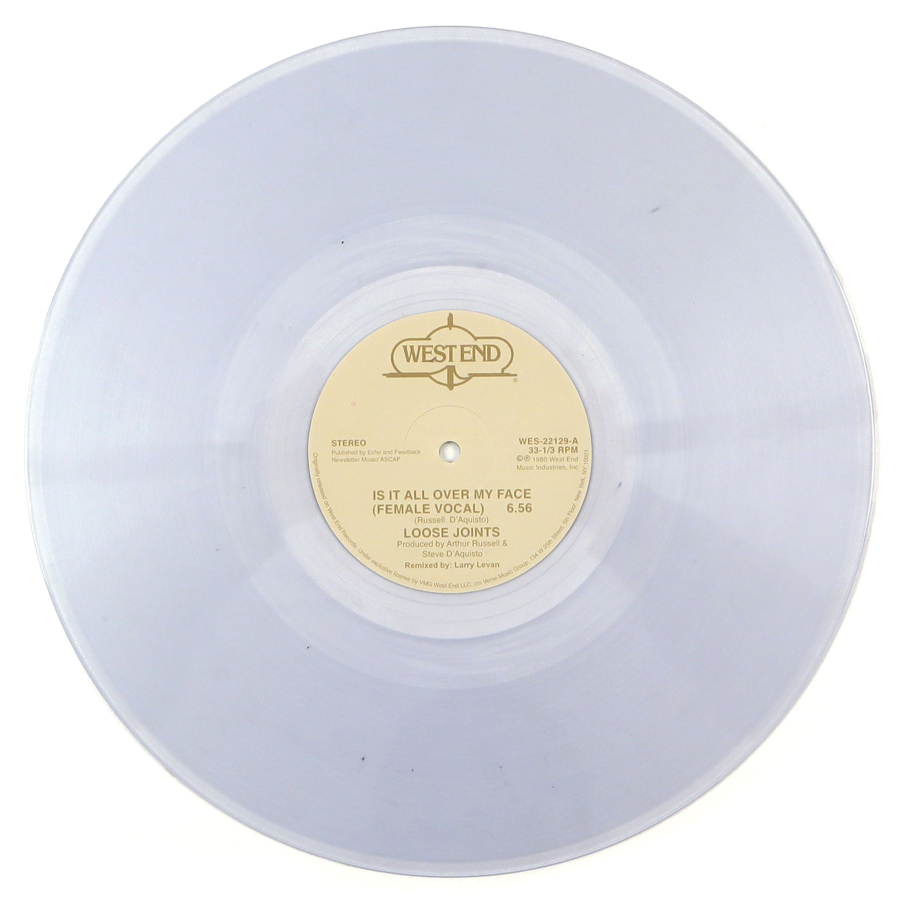 "Is It All Over My Face" is one of the most classic underground dance tracks ever. Its winning combination of insanely funky, minimal proto-house percussion, bass and keyboard work (courtesy of leftfield disco genius Arthur Russell) and great sleazy, double-entendre lyrics - "Is it all over my face?/You caught me love dancin'" made it an instant favorite with New York and Chicago DJs like Larry Levan and Ron Hardy, and it has endured ever since. This version contains both the rarely heard Male Vocal version which is heavier on percussion, and the sweeter, more widely known Female Vocal. Like so many of my favorite disco records, this was one those situations where the drummer was paid in coke before the session, instead of afterwards, resulting in an open drum break at the beginning of the track and many moments of spontaneous cumbustion along the way. In Chicago, dancers scream back "hell yeah" in response when the DJ cuts out the song after the question "Is it all over my face?" The first time a fellow DJ showed me that trick while I was playing it out in Chicago to a packed house party, and I heard 100 people screaming that back at me in unison, my career fate was sealed. Buy it already - it's an absolutely essential dance classic. 2022 repress on clear vinyl, recommended.