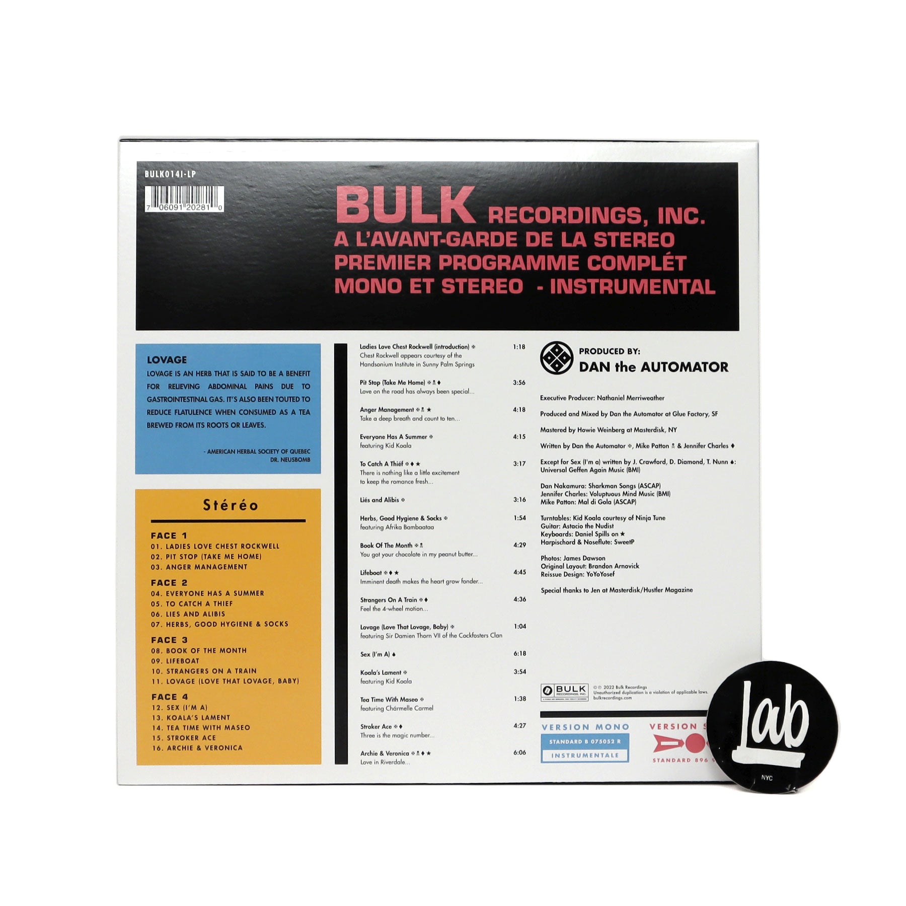"'Lovage' is defined as 'an herb that is said to be a benefit for relieving abdominal pains due to gastrointestinal gas…also touted to reduce flatulence when consumed as a tea.' But when placed in the able hands of sonic mastermind Dan 'The Automator' Nakamura recording under the guise of musical lothario Nathaniel Merriweather the result is a concept album of 'music to make love to your old lady by.' With the help of collaborators such as Mike Patton (vocals) Jennifer Charles (vocals) and Kid Koala (turntables) Merriweather serves as your personal guide to the sensual side of life painting a satirical darkly funny portrait of love and sex with left-field hip-hop and instrumentals as only he can do." - Bulk Recordings