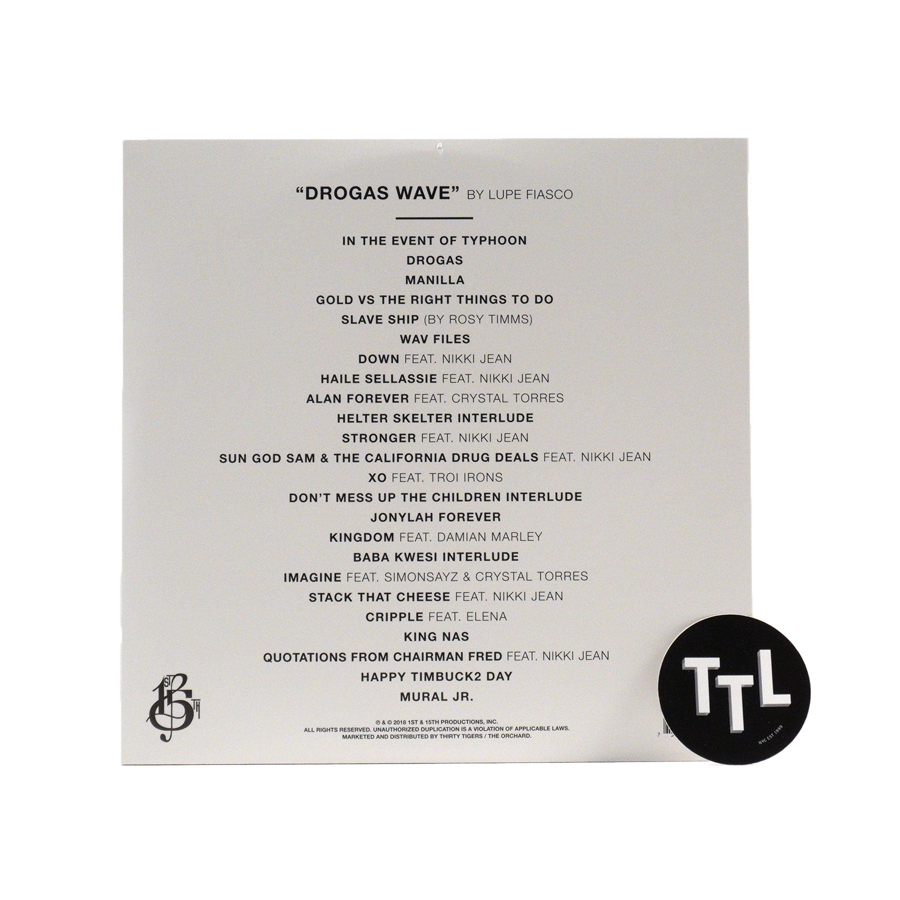 "An anticipated follow up to his no. 1 rap album 'Drogas Light,' the 24-track new 'Drogas Wave' stands alone as yet another reminder that Lupe Fiasco has more to say, delivering to ravenous fans his most philosophically artistic project to date. 'Drogas Wave is based on a story about a group of slaves that jumped off of a slave ship transporting them from Africa,' said the independent rapper. Adding, 'The slaves did not drown, and instead somehow managed to live under the sea. They spent the rest of their underwater existence sinking slave ships. 'Drogas' is the Spanish word for drugs. I made it an acronym which stands for 'Don't Ruin Us God Said.'" - 1st & 15th