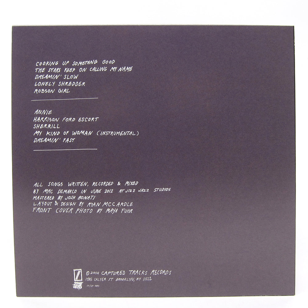 "Daddy’s on the sofa; pride of the neighborhood..." These are the outtakes and alternate versions from the sessions for 2, which is Mac Demarco’s second official release for Captured Tracks but technically only his debut full-length. The album offered a slightly more polished sound from the lo-fi warble that permeated Rock And Roll Night Club, and these demo recordings show a rougher side of the otherwise more polished tunes on 2. Lo-fi fetishists will love the kitchen table drums and overall murk of this early recording of “Cooking Up Something Good.” The sparkly guitars and tongue-click drums on these versions of “The Stars Keep On Calling My Name” and “Sherrill” recall Worn Copy-era Ariel Pink (I tried to get through this review without mentioning him but just couldn’t do it), and I think I might actually prefer them to the versions that ended up on 2. I'm definitely partial to these two (2!) recordings of “Dreamin” - both the scuzzy “Dreamin’ Fast” and the woozy screwtape version “Dreamin’ Slow” - over the album version. Best song title goes to the instrumental “Harrison Ford Escort,” which would eventually become the killer “Freaking Out The Neighborhood” on 2. Also check out the alternate instrumental demo of “My Kind Of Woman” and “Lonely Shredder,” which would serve as the instrumental basis of “Ode To Viceroy.” Limited edition repress on seafoam green vinyl to celebrate the 10th anniversary of Captured Tracks, recommended.
