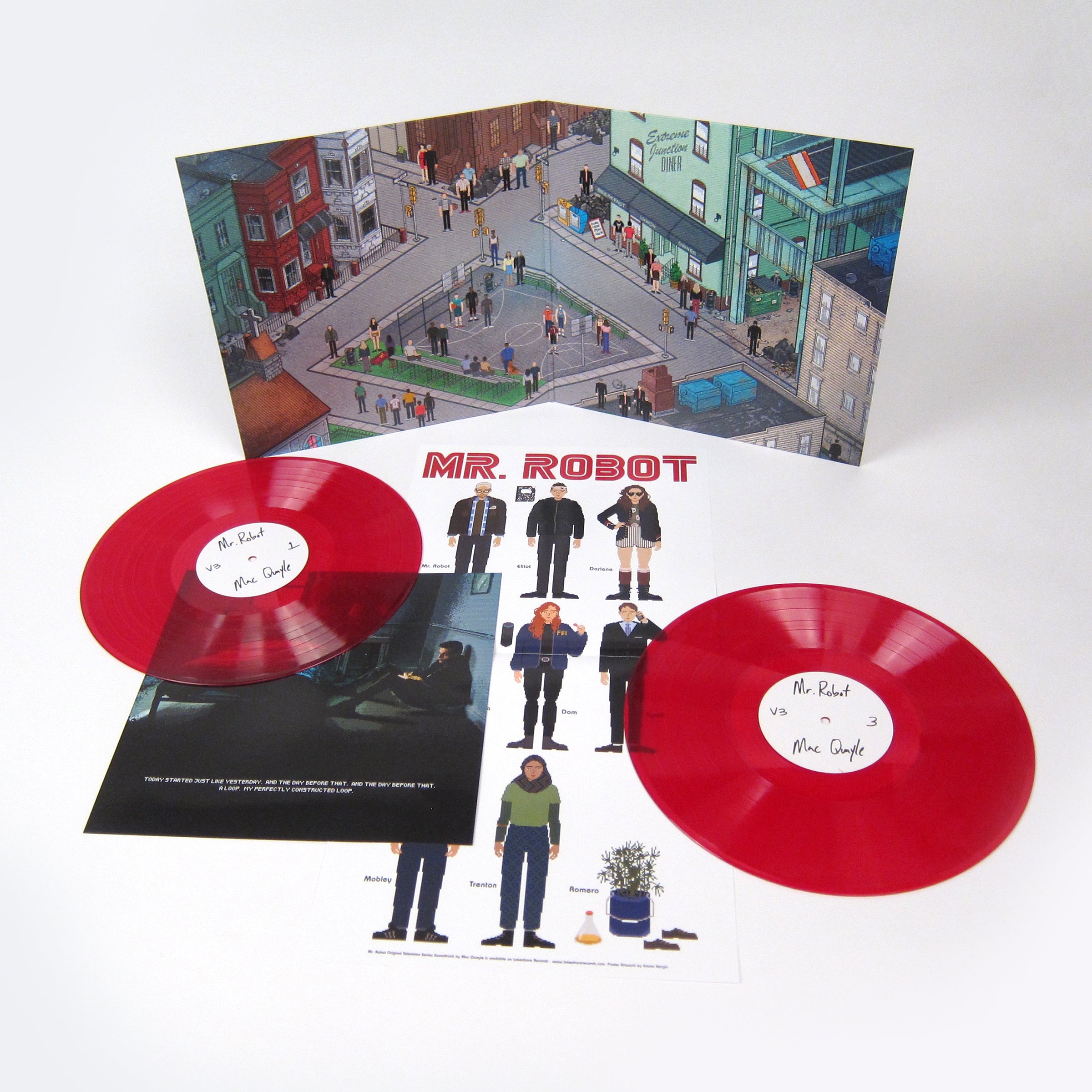 • A bug is never just a mistake. It represents something bigger. Mac Quayle's ongoing score to the hit series Mr. Robot delivers more hypnotic soundscapes for paranoid hacker adventures. This is volume 3 of the soundtrack and includes more unsettling synths, sparse rhythms, and dark ambient moods that bring the world of Elliot and Evil Corp. to life. Comes pressed on double 140 gram transparent red colored vinyl, and includes fold-out 11x22" poster, printed inner sleeves with liner notes by the composer, and custom jacket designed in retro-16-bit style by award winning art director John Bergin.