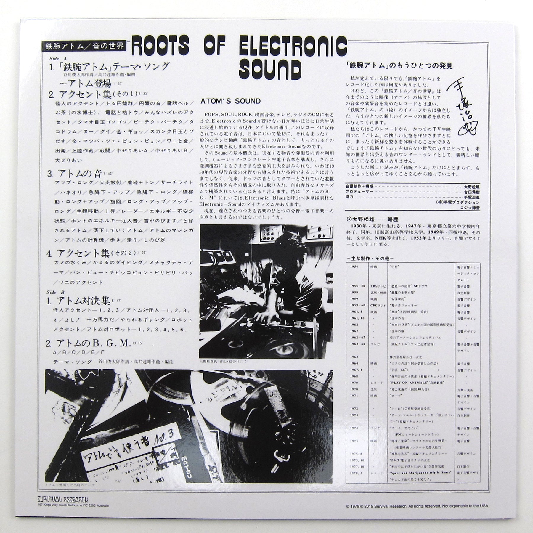 Matsuo Ohno was born in the Kanda district of central Tokyo in the late 1930’s, which was subject to constant bombing raids through the end of World War II. During the long period of rebuilding after the war he was unaffected by contemporary pop music and culture, aside from the electronic experimentation of German composer Karlheinz Stockhausen and left-wing filmmaker Fumio Kamei. His first experience in sound design was with the famous Bungaku-za theatre group, which staged performances of ancient classics and contemporary plays from the West. He also worked at Japan’s national broadcasting network NHK in their equivalent of the BBC’s Radiophonic Workshop, but became frustrated by the corporate restrictions and quit, his exceptional skill giving him the rare opportunity to work as a freelancer, where he refined his techniques with the latest and greatest in analog synthesizers. The tracks on Roots of Electronic Sound are primarily experimental sound effects and motifs that were originally recorded between 1963 and 1966, with many cues used in the animated adaptation of Osamu Tezuka’s unbelievably influential Mighty Atom (Astro Boy), one of the first anime productions ever. This is the first domestic issue of this album, and includes a printed insert with liner notes in Japanese.