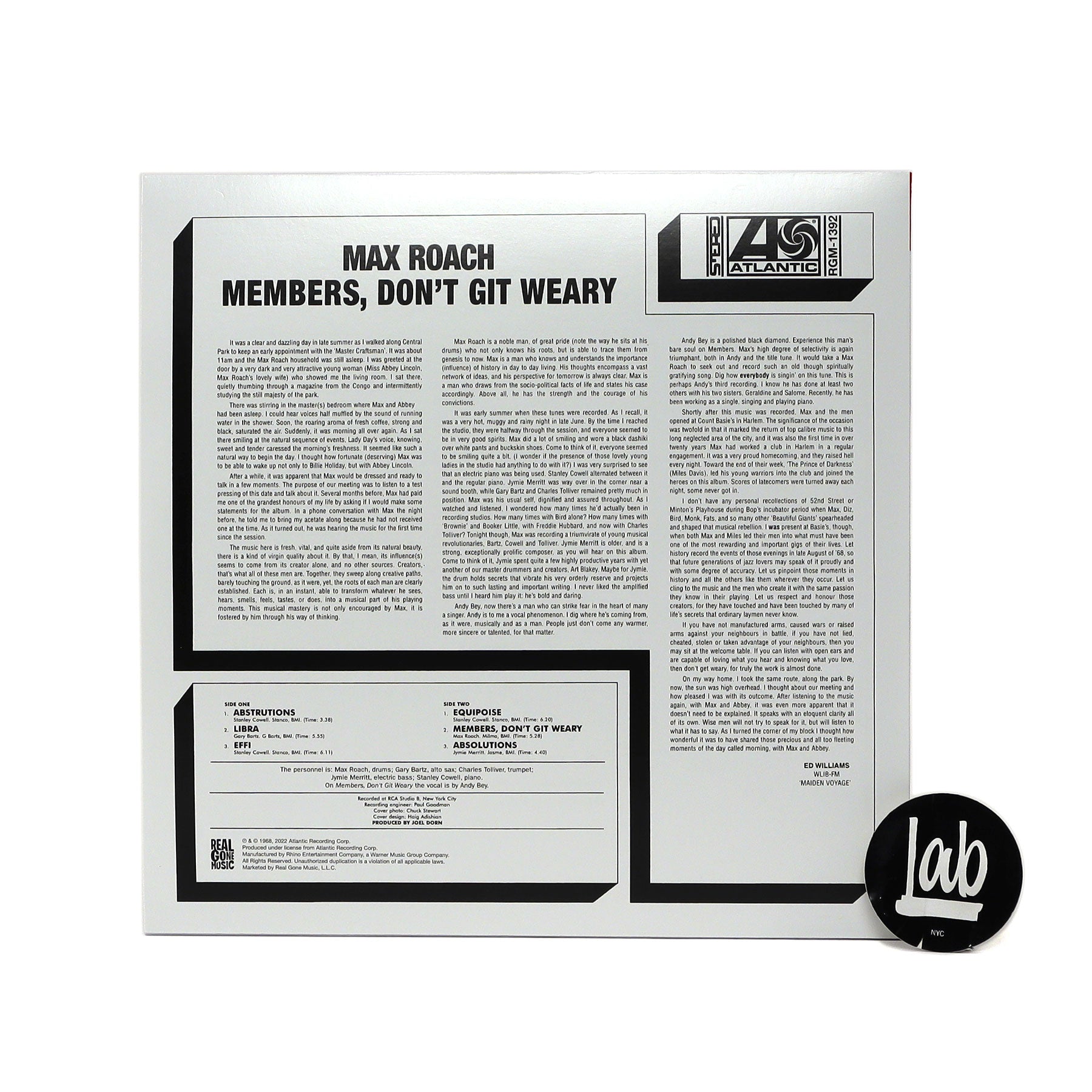 "Max Roach wasn't just one of the greatest drummers and percussionists in jazz history; he was also one of the greatest bandleaders in all of jazz, able to adapt his playing to an innumerable array of styles, from bop to free, and blessed with a keen eye and ear for talent. And he always, always kept pushing himself and his bandmates to find new modes of musical expression throughout his six-decade career. Speaking of modes, this 1968 release on the Atlantic label is one of his finest albums, a masterpiece of modal jazz featuring a crack outfit of saxman Gary Bartz, trumpeter Charles Tolliver, bassist Jymie Merritt, pianist Stanley Cowell (composer of half the tracks on the album including the gem 'Equipoise'), and, on the title track, vocalist Andy Bey. Discerning ears might detect the first hints of jazz fusion, but Members, Don’t Git Weary is simply modern jazz of the highest order. First American vinyl reissue and long overdue!" - Real Gone Music