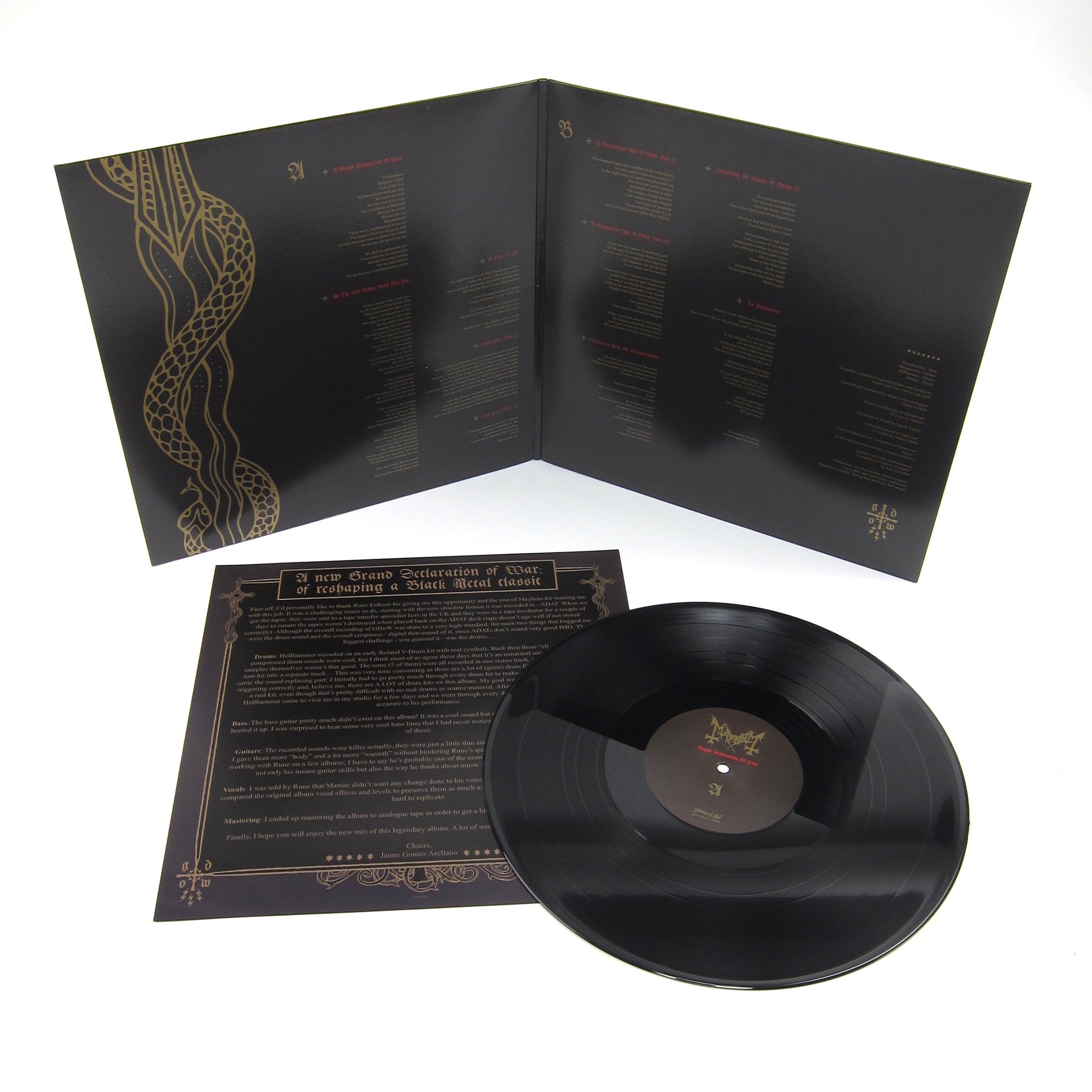 • "We declare not peace but war." Sophomore full length from controversial black metal pioneers, Mayhem. The infamous Norwegian band is known equally for their disturbing history which includes a suicide, a murder, and a string of church burnings (movie coming soon), as their extreme musical style. Grand Declaration Of War was originally released in 2000 and found the band evolving (with inspiration from Friedrich Nietzsche), beyond the usual black metal tropes with a new level of sonic clarity, and an expanded range that includes the divisive industrial electronic beats of "A Bloodsword and a Colder Sun," and the 10 minute doom metal of "Completion in Science of Agony." This 2018 reissue features completely remixed and remastered sound from the original master tapes, pressed on black vinyl with gatefold sleeve and printed insert. Only 1,000 pressed.