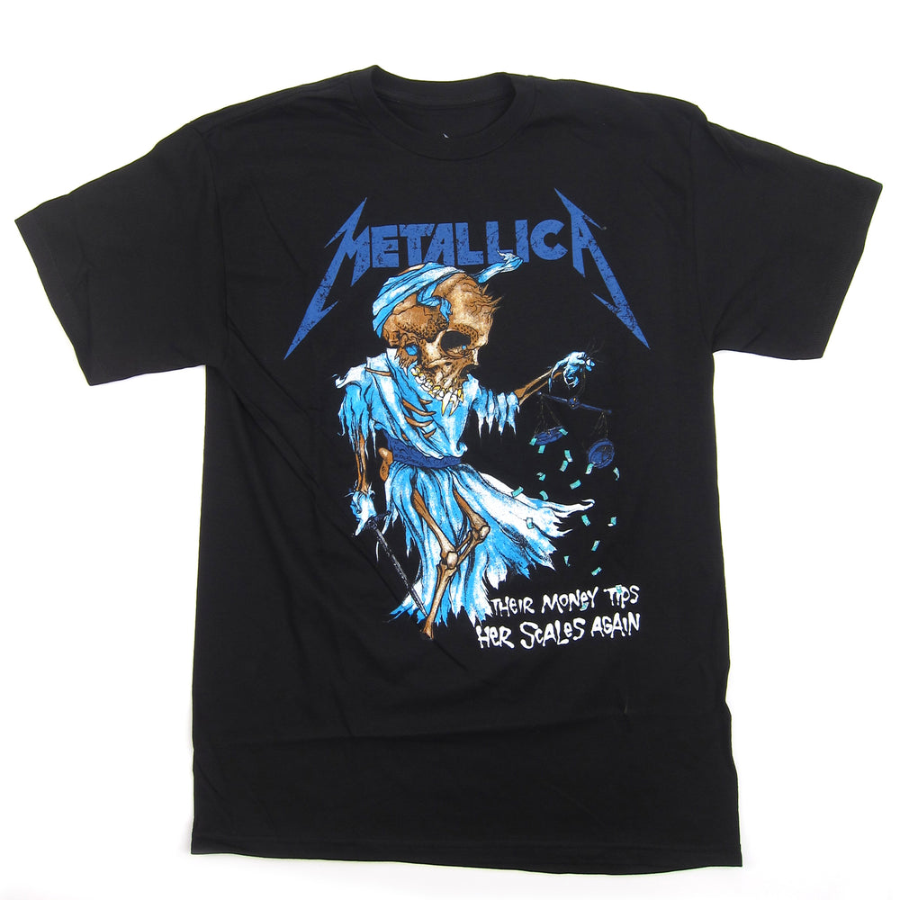 Their money tips her scales again... Metallica's "Doris" (from the cover of And Justice For All) gets illustrated by the masterful hand of Pushead for this tee, and Lady Justice has never looked so gnarly. Full color print on the front and back for a double dose of Doris awesomeness.