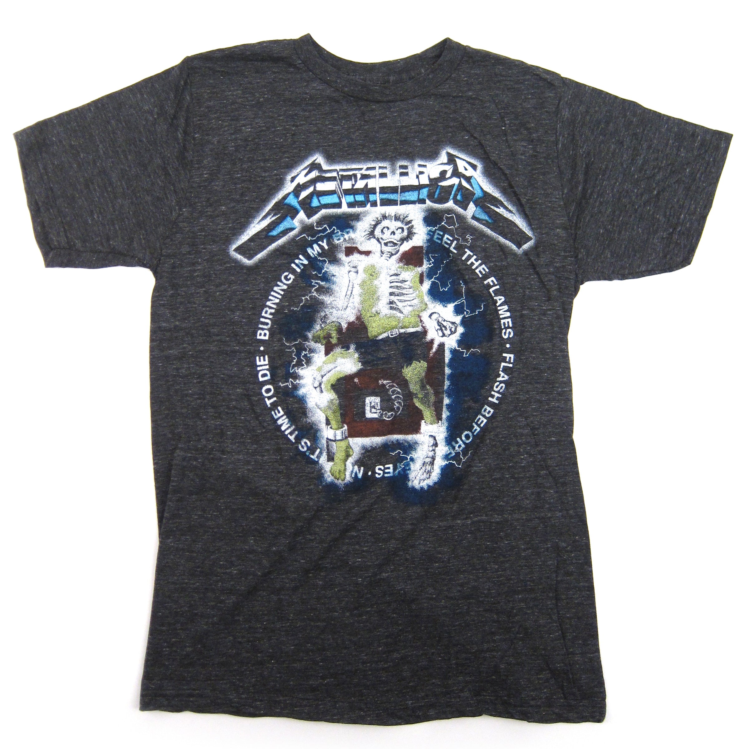 Flash before my eyes / Now it's time to die / Burning in my brain / I can feel the flames. Official Metallica tee featuring a killer Ride The Lightning illustration on soft, blended cotton tees.