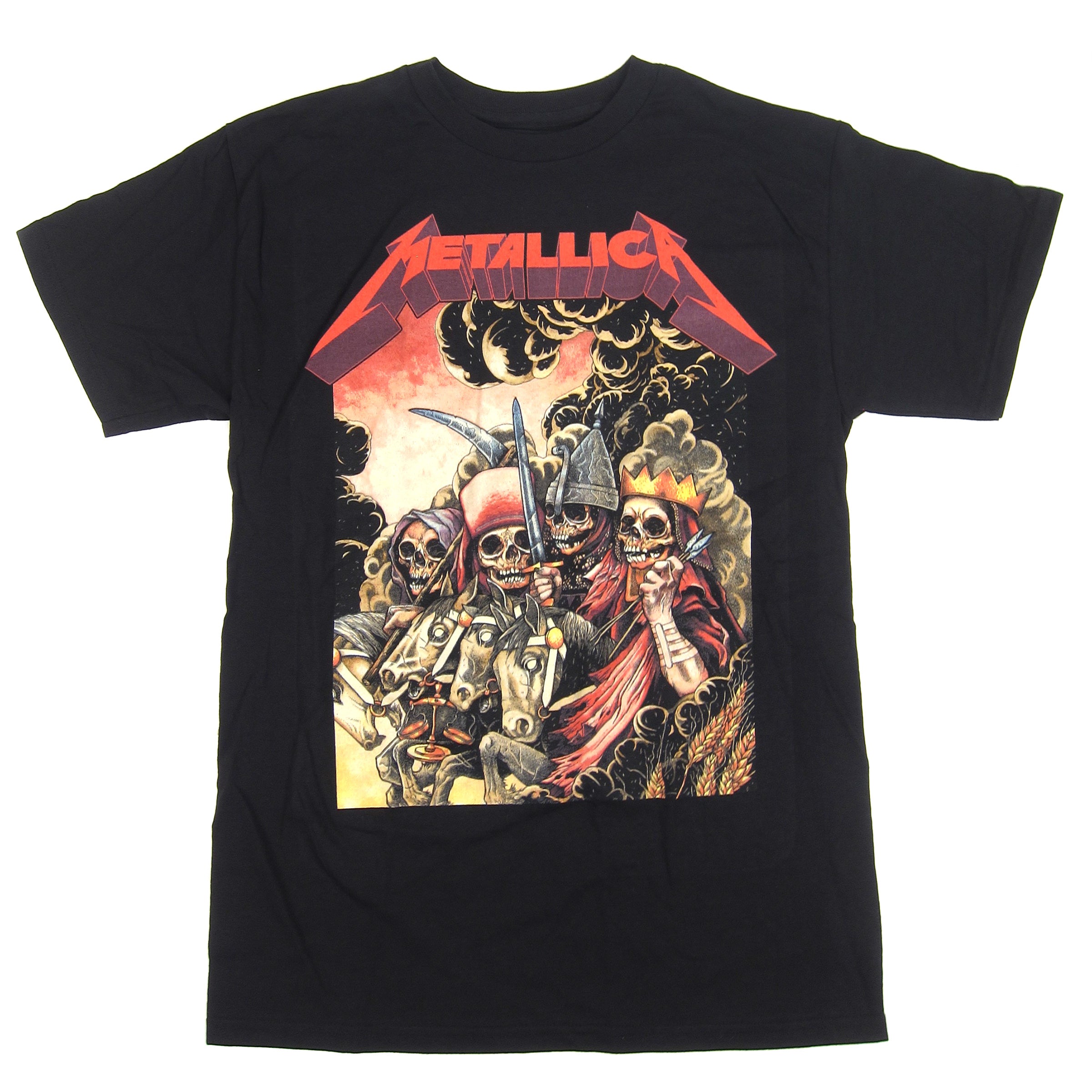 The horsemen are drawing nearer / On the leather steeds they ride / They've come to take your life / On through the dead of night / With the four horsemen ride / Or choose your fate and die. Official Metallica tee featuring artwork inspired by "Four Horsemen" off Kill 'Em All. Comes printed on all cotton, standard fit tees.