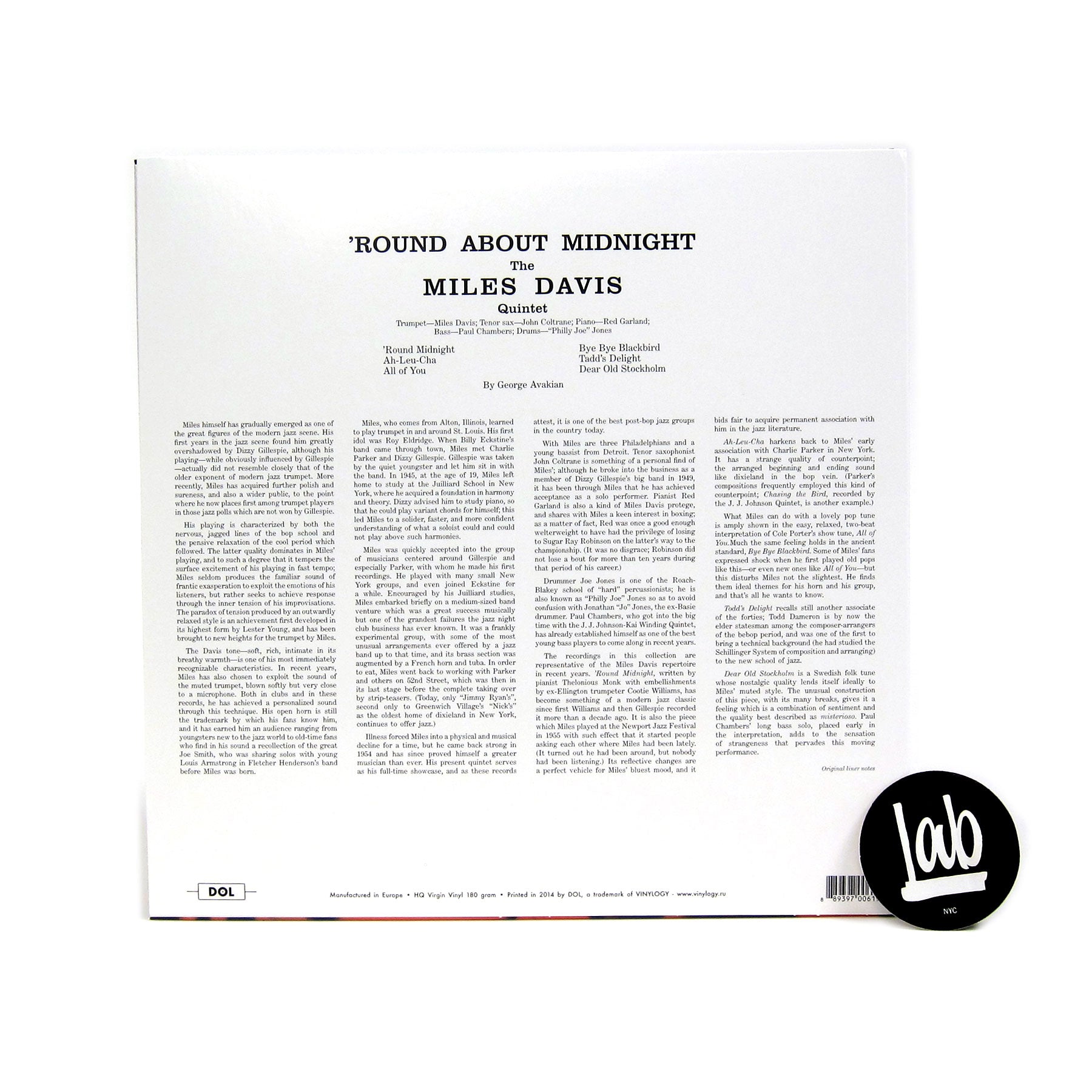 "Round About Midnight is an album by jazz musician Miles Davis. It was his debut on Columbia Records, and was originally released in March 1957. The album took its name from the Thelonious Monk song 'Round Midnight. Recording sessions took place at Columbia Studio D on October 26, 1955, and at Columbia's 30th Street Studio on June 5 and September 10, 1956. Although it had a lukewarm reception upon its release, 'Round About Midnight has since been regarded by critics as a masterpiece of the hard bop genre and one of the greatest jazz albums of all time." - Columbia