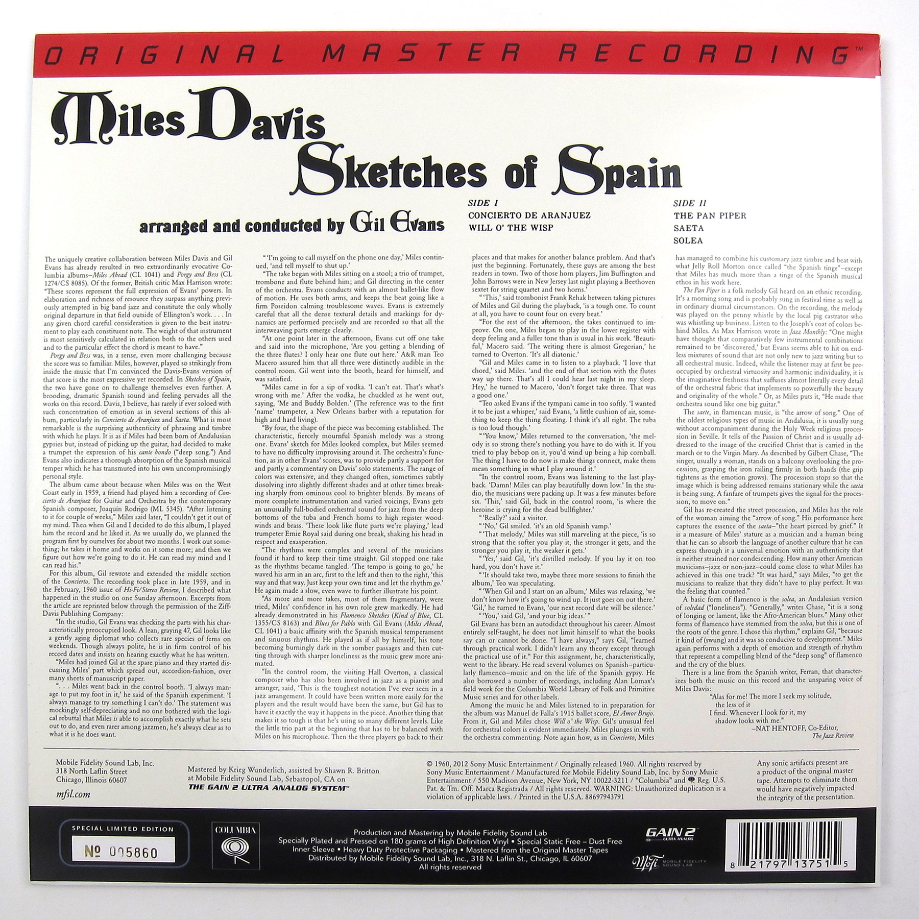 Special audiophile edition on 180 gram vinyl. This album pairs up Miles Davis with arranger and composer Gil Evans. The compositions are inspired by traditional Spanish folk music and go in a different direction than the pair's previous two records together. Evans' arrangements make effective use of wind instruments where other composers would have turned to strings. Flute, trumpet and trombone make the bed for Davis' lead. Miles seems to have gained some Andalusian gypsy ancestry with this record. His trumpet playing evokes the cante hondo guitar stylings found in folk music from the region. When talking about this record Davis is quoted as having said, "I always manage to try something I can't do." He appears to wipe that sentiment away with his effortless improvising over the complex score that Evans has crafted. Limited numbered edition featuring half-speed production and mastering by MoFi Sound Lab on the Gain 2 Ultra Analog System.