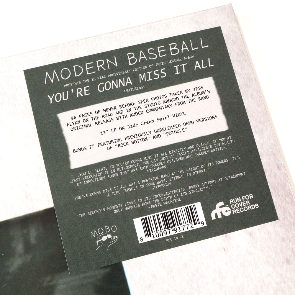 "It’s been ten whole years of us listening to Modern Baseball’s iconic record You’re Gonna Miss It All, and to celebrate Run For Cover has teamed with the band to deliver a deluxe anniversary edition worthy of its legacy. This version of the band’s second album is a collector’s delight - two discs enclosed in a heavyweight, hardcover 12” x 12” book with 96 pages of photos from longtime collaborator Jess Flynn. Each member of Modern Baseball also contributed notes to provide context to the countless photos taken while touring, recording, skateboarding, napping, swimming and a whole lot more. This deluxe edition also includes two never-before released demos of “Rock Bottom” and “Pothole” pressed on an exclusive 7”. These early, intimate versions show how the ideas behind these two favorite tracks progressed into the final takes that made it onto You’re Gonna Miss It All." - Run For Cover Records