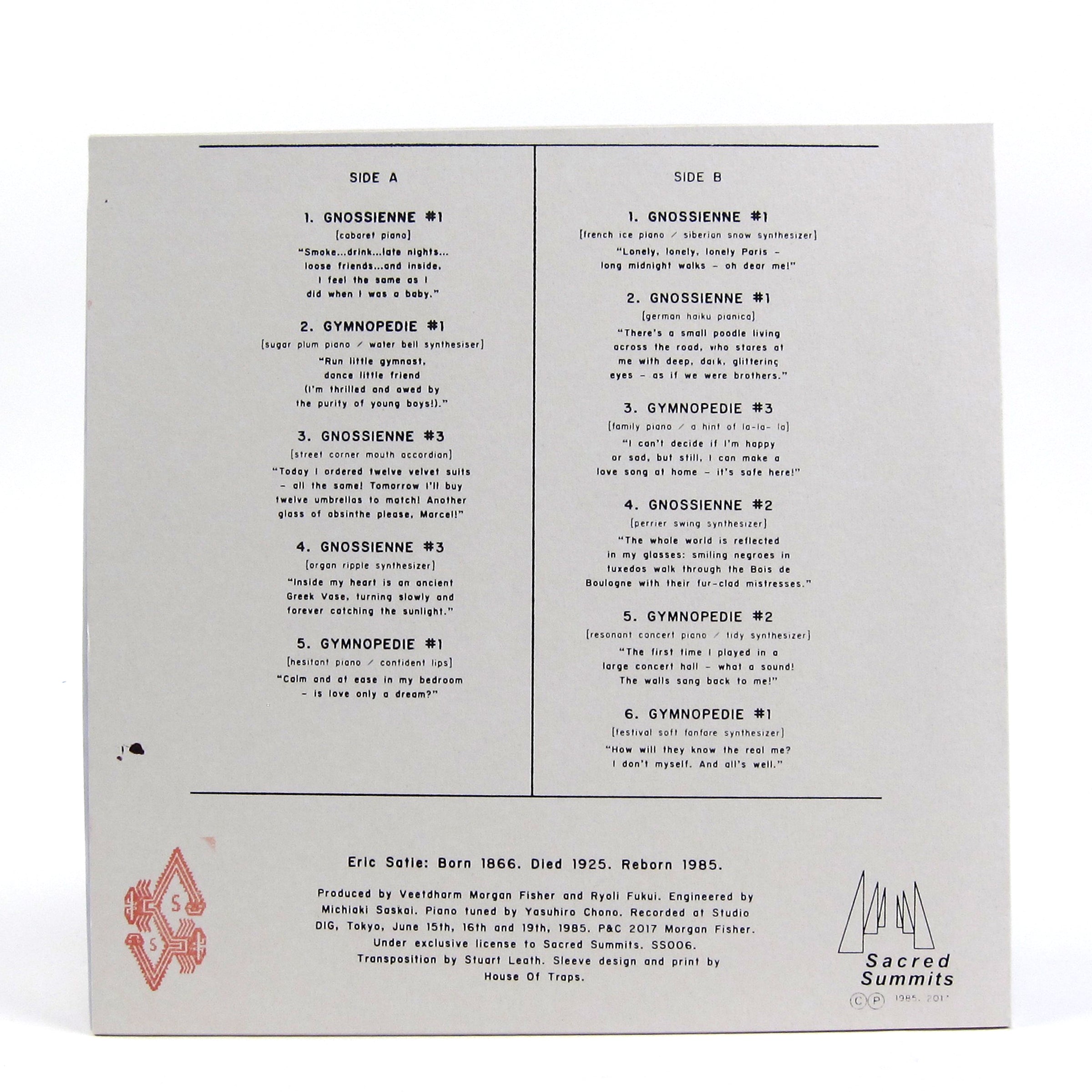 Beautiful interpretations of Erik Satie from veteran composer Morgan Fisher. Inside Satie was originally released in 1985 and found Fisher, who was based in Japan at the time (working with the likes of Yoko Ono, Haroumi Hosono and Dip In The Pool), improvising several Satie favorites on piano, melodica, and synthesizer with generous dollops of tape reverb. The result is delightfully free and pure, and a very worthy tribute to the work of Satie. From Fisher himself - "Inside Satie is one of the first albums I recorded in Japan shortly after moving here in 1985. In three days I improvised on several of my favourite Satie themes. Mostly I played piano as well as the rich, analog-sounding Yamaha GS-1 (precursor of the DX-7), and sometimes used long tape delays to build layers of sound. All the pieces were recorded in single takes - no overdubs (no time!)." This is the first ever vinyl reissue from Sacred Summits, complete with beautiful new silk-screened cover art. Recommended.