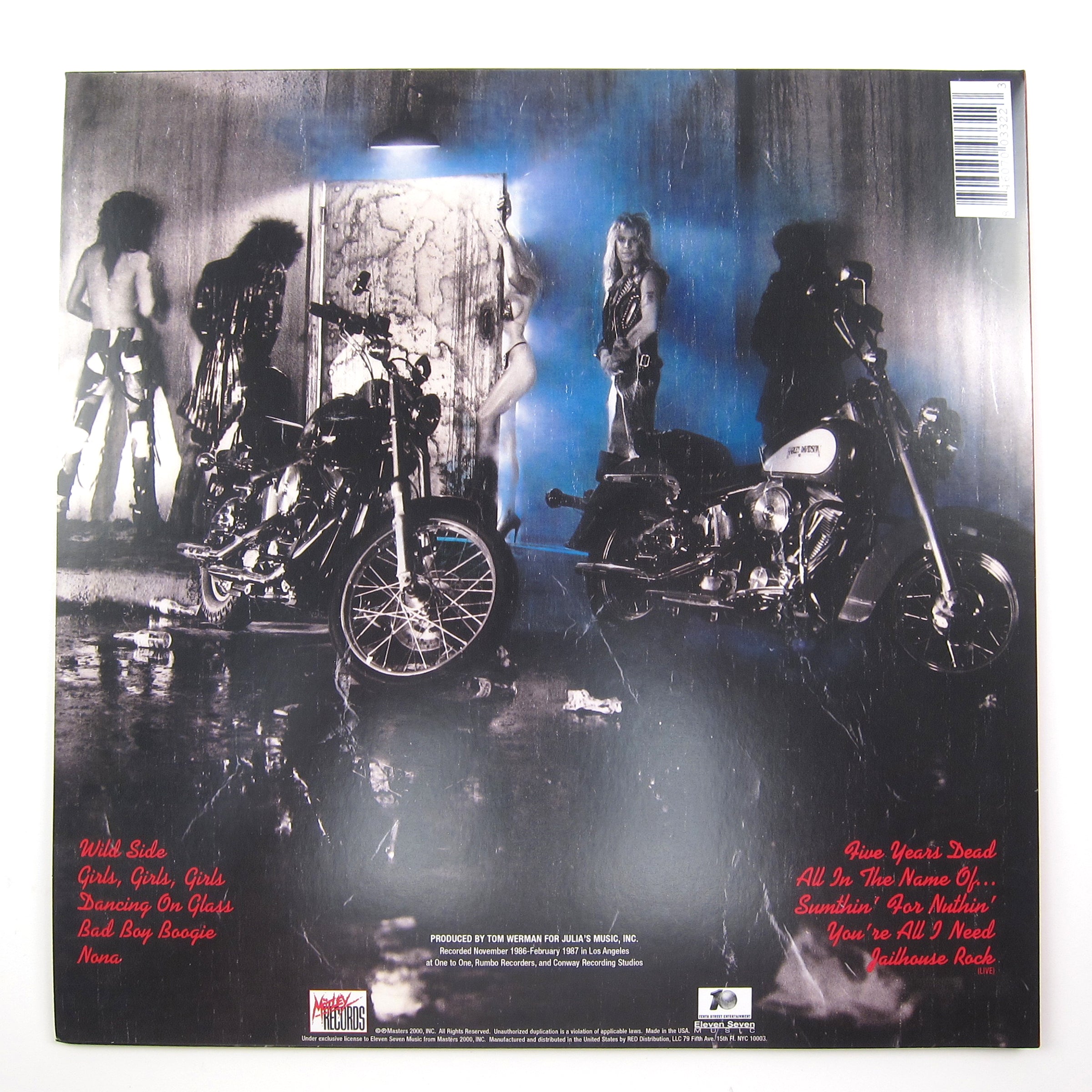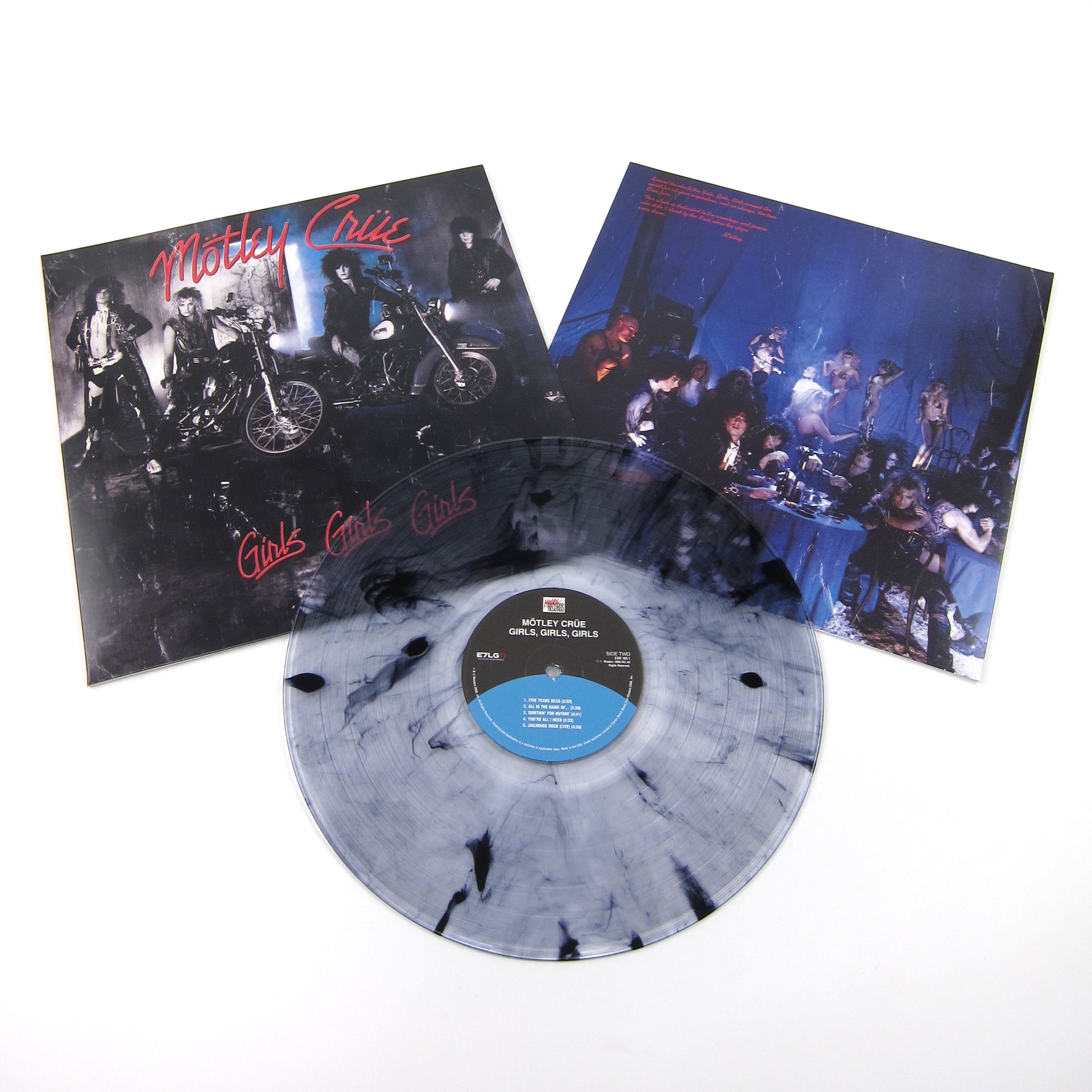 Fourth studio album from hair metal hedonists, Mötley Crüe. Girls, Girls, Girls was originally recorded between November 1986 and March 1987, and found the group playing up the sleaze in an attempt to capture the grittiness of their debut. The album seems to sum up the feeling of cruising down the Sunset Strip on your Harley wearing leather chaps while drunk on Jack Daniels. Includes the songs: "Wild Side," "Girls, Girls, Girls," "You're All I Need," and "Jailhouse Rock." Ten tracks in all. Released by by Mötley Records on marbled colored vinyl.