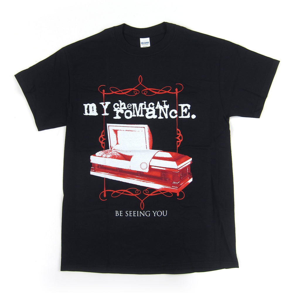 Red, black and white t-shirt w/ a coffin "Be Seeing You" logo on the front… Super chill goth vibes, and the typewriter-font is a nice touch also, a welcome addition to your My Chemical Romance merch collection. 100% cotton.