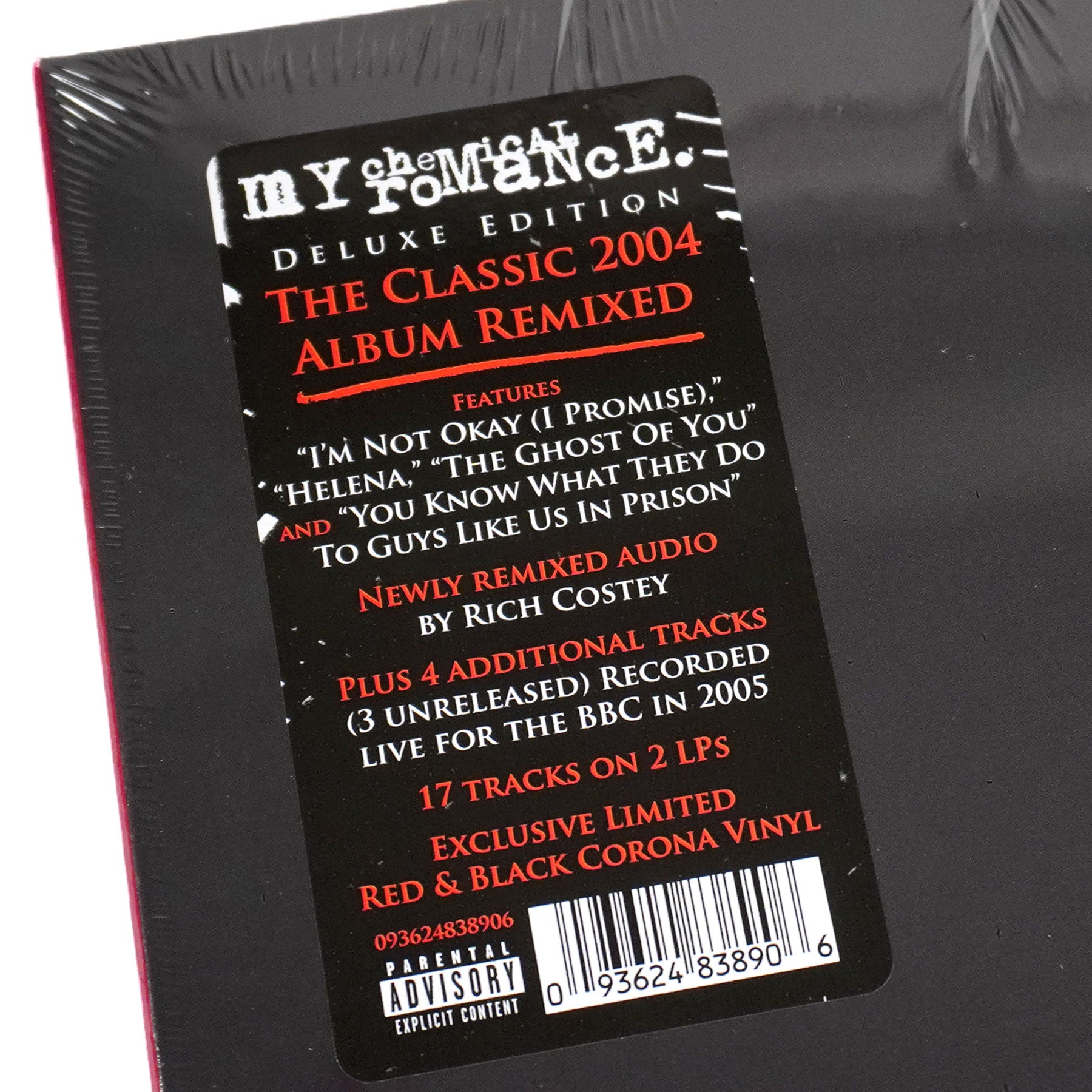 "My Chemical Romance’s Three Cheers For Sweet Revenge (Deluxe Edition) available on 2LP Indie/D2C Exclusive Red & Black Corona Vinyl. The entire 13-track album has been remixed by Rich Costey and packaged in brand new artwork. Additionally, four bonus tracks recorded for BBC in 2005 have been included. Three of the bonus tracks are previously unreleased live versions of 'I'm Not Okay (I Promise),' 'Helena,' and 'The Ghost Of You.' The fourth bonus track is a live version of 'You Know What They Do To Guys Like Us In Prison'." - Reprise