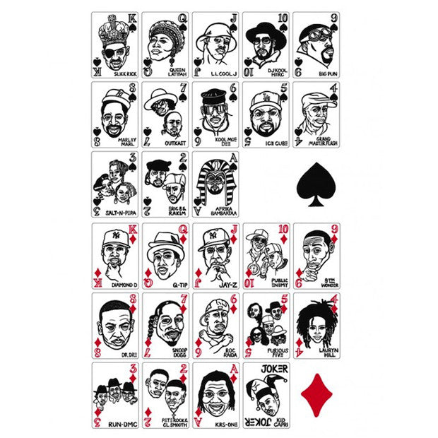 Artist Sayori Wada teams up with Tokyo's Mynority Classics for some of the freshest playing cards you've ever seen. What makes this set so special? Each card features a hand drawn illustration of a hip-hop icon - from Biggie Smalls to 2Pac, Big L to Big Daddy Kane, Eric B & Rakim, RUN DMC, J. Dilla, Wu-Tang, and many others. Plus the back of the cards are printed to look like an old school cassette. Too dope!