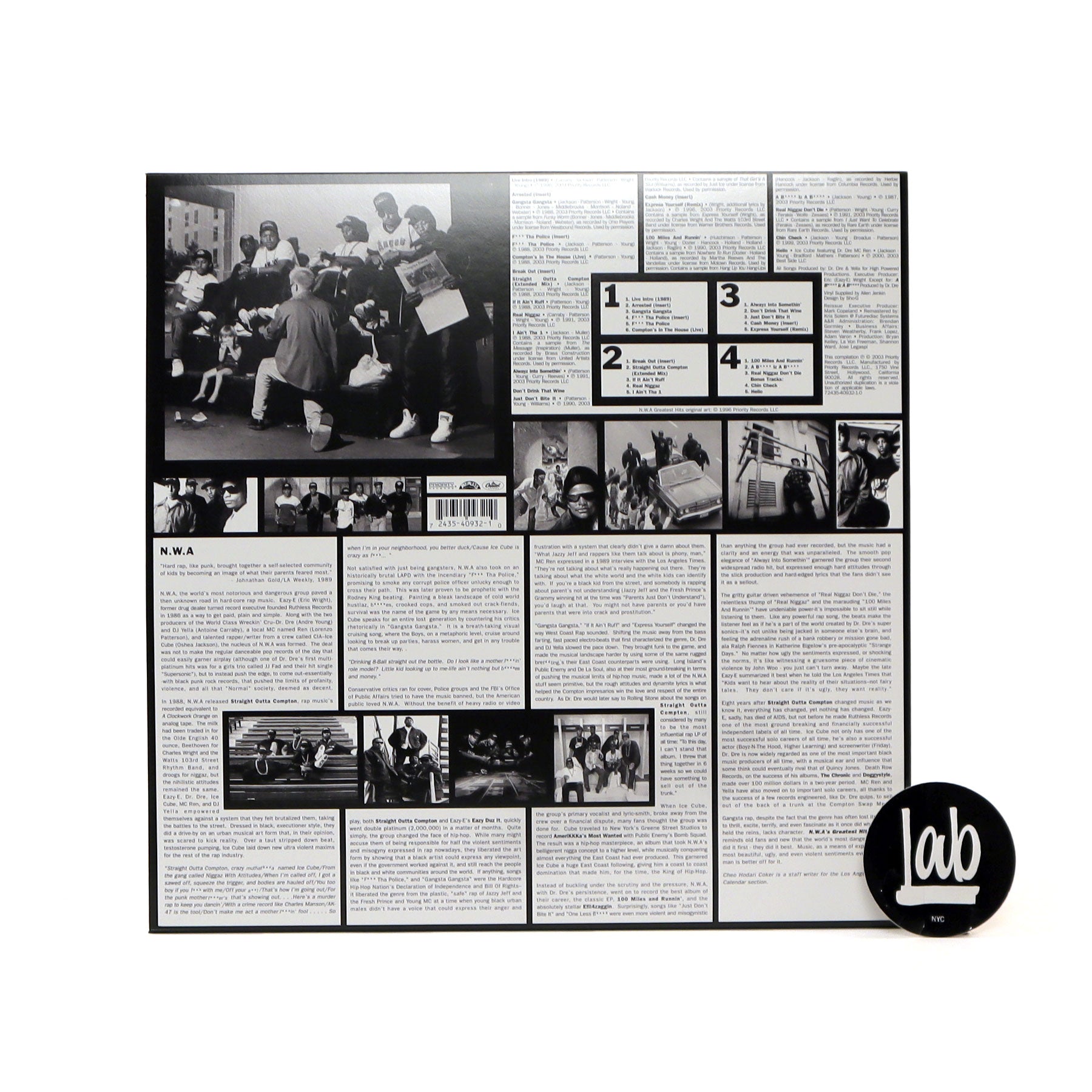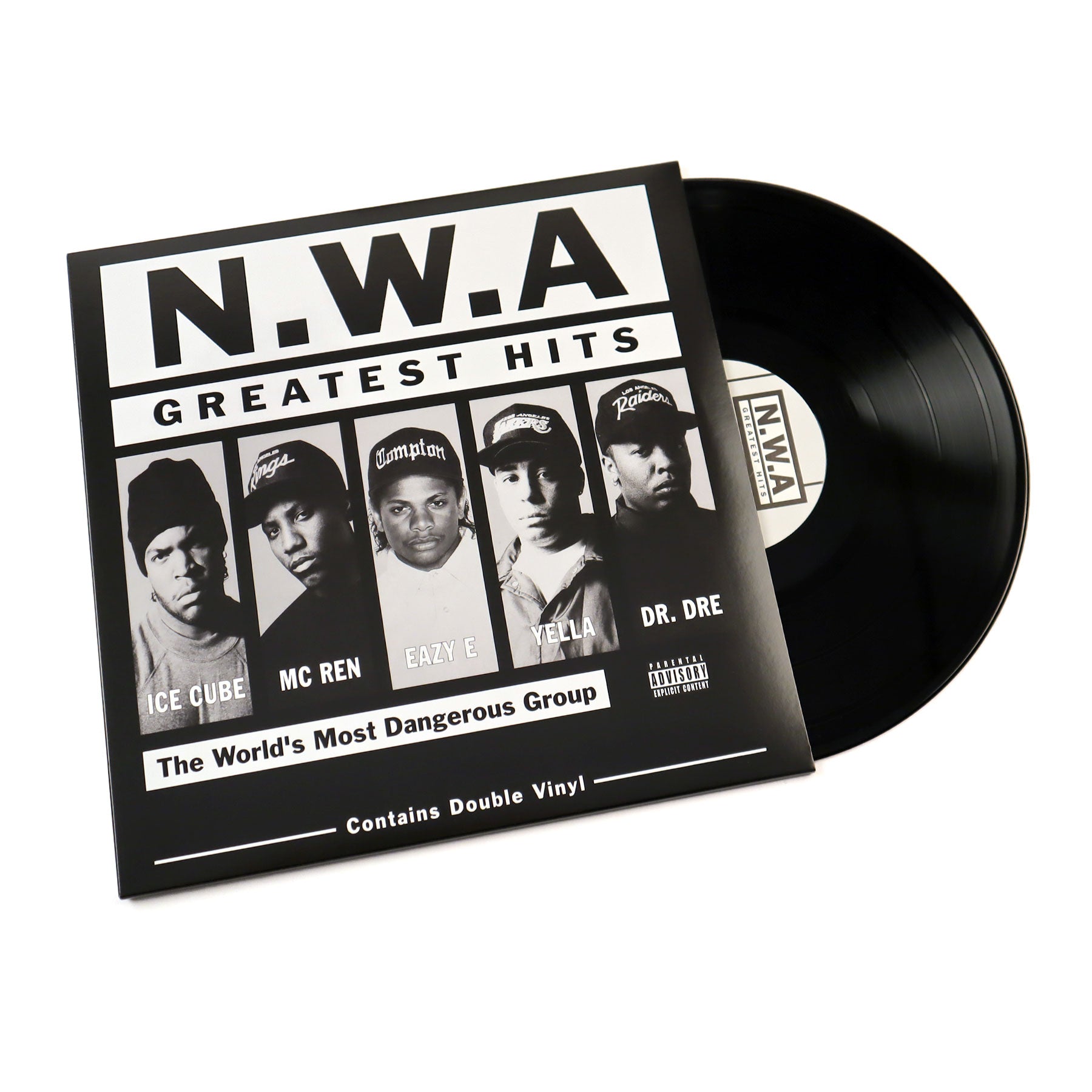 "N.W.A.'s Greatest Hits is a greatest hits album originally released on July 2, 1996. The re-released version contains two bonus tracks by the reunited group. The track 'Chin Check' was recorded by Ice Cube, Dr. Dre, MC Ren and Snoop Dogg under the N.W.A name for the soundtrack of Next Friday. 'Hello' first appeared on Ice Cube's sixth studio album War & Peace - Volume 2 (The Peace Disc) and featured Dr. Dre & MC Ren. N.W.A.'s career isn't necessarily one that lends itself well to anthologies. Though they had important singles, especially in the underground hip-hop community in the late '80s, they never received any support from radio or MTV, which meant they never had any official 'hits.' Instead, their albums were more important, popular, and influential, than their singles, even if individual tracks - 'F*** tha Police, ' 'Straight Outta Compton, ' 'Gangsta Gangsta, ' 'Express Yourself' - became the focus of attention." - Priority Records