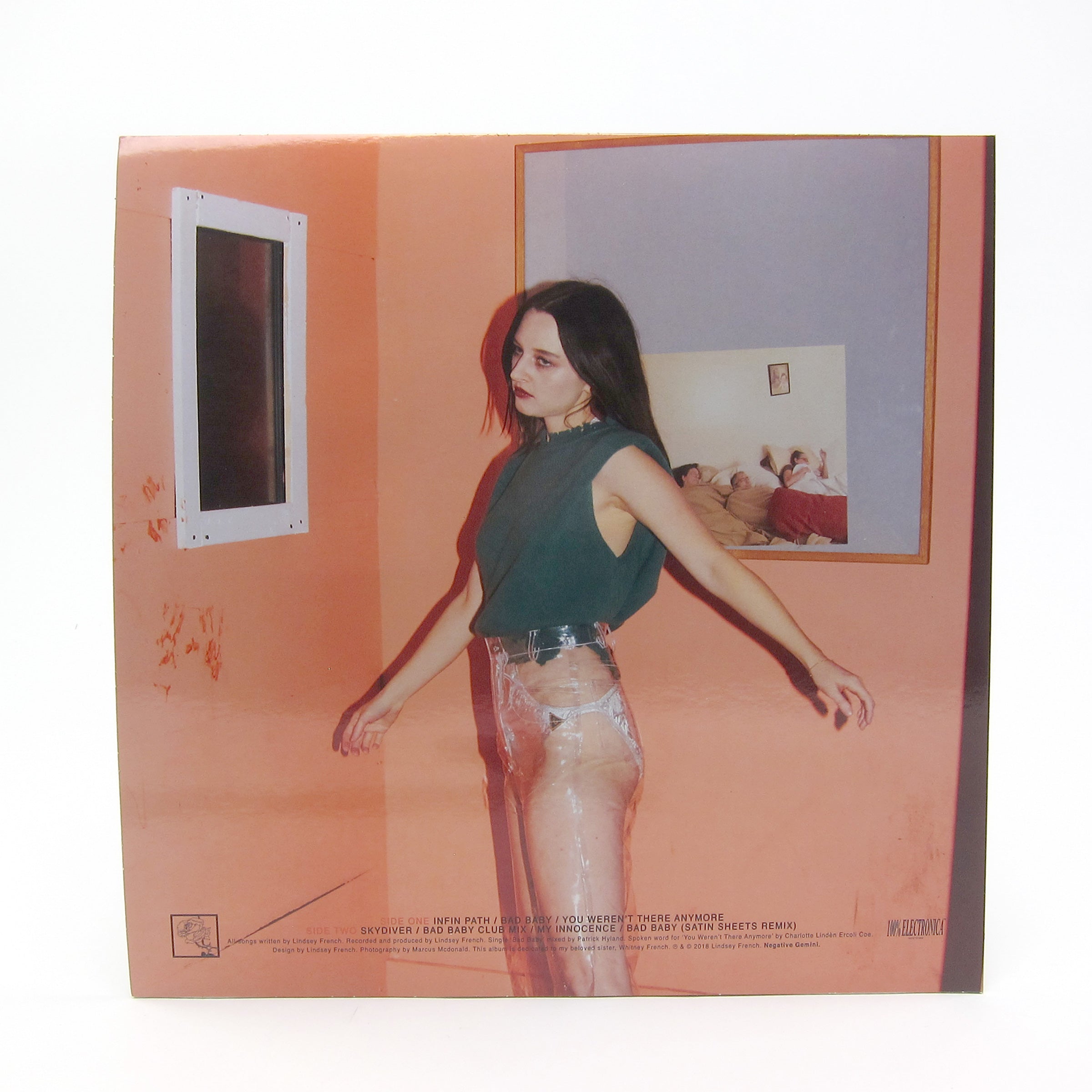I’ve put myself on a sort of cassette embargo after accumulating stacks and stacks of tapes that never really get played. And I had just about convinced myself to be a bad baby and the pull the trigger on the cassette version of this latest EP from Negative Gemini, when a surprise vinyl edition magically touched down here at Lab HQ straight from 100% Electronica, the label Negative Gemini (nee Lindsey French) runs with George Clanton. Her Body Work LP was ubiquitously hyped in 2016, but this one seems to crystalize all her strengths into a short and sweet package, drawing inspiration from the 6-string balladeering of 90s dreampop, vintage 4AD-grade vocal etherea and late nite MTV electronica; like a feminine counterpoint to Clanton’s recent Slide LP. Opener “Infin Path” draws you into Negative Gemini’s dreamworld, where vaporous pads cascade into jungle breaks and lethal trap rhythms and French’s vocals wax and wane between the cracks. She shifts her sights to balladry on the title track, lilting freely between moody garage (*garridge) shuffle and a gigantic wall-of-sound power pop refrain (reappearing on the B-side in ‘club mix’ form with nods to early Orbital as well as a new remix by Satin Sheets not found on the original cassette). Her melodic sensibilities (and guitar playing) are flexed strongest on “You Weren’t There Anymore,” one of the record’s gentler tracks but also the most enduring. “Skydiver” and “My Innocence” are dazzling as well. At just 7 tracks (2 of them remixes) you’ll be begging for more. These are the last copies on red vinyl housed in shiny metallic sleeve; once they’re gone, they’re gone. Recommended.