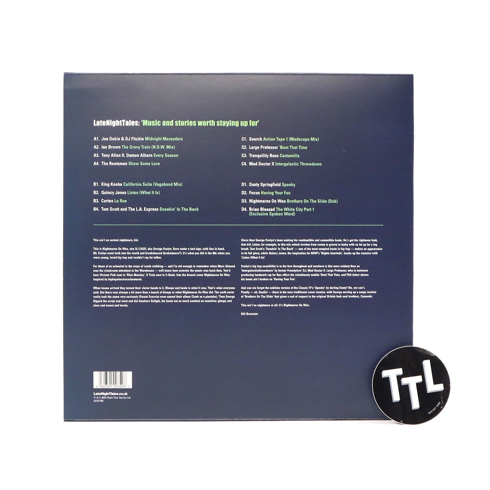 "A 2024 reissue of Nightmares On Wax's seminal Late Night Tales compilation. Tom Scott's 'Sneakin' In The Back' — one of the most sampled beats in hip hop — makes an appearance in its full glory, while Quincy Jones, the inspiration for NOW's 'Nights Interlude', backs up the classics with ‘Listen (What It Is)’. George Evelyn's hip hop sensibility is to the fore throughout and nowhere is this more evident than on ‘Intergalactic Throwdown' by former Freestylers' DJ, Mad Doctor X. And can we forget the sublime version of the Classic IV's 'Spooky' by darling Dusty? No, we can't. Finally — oh, finally! — there is the now-traditional cover version, with George serving up a soupy version of 'Brothers On The Slide' that gives a nod of respect to the original British funk soul brothers, Cymande. This ain't no nightmare at all: it's Nightmares On Wax." - Late Night Tales