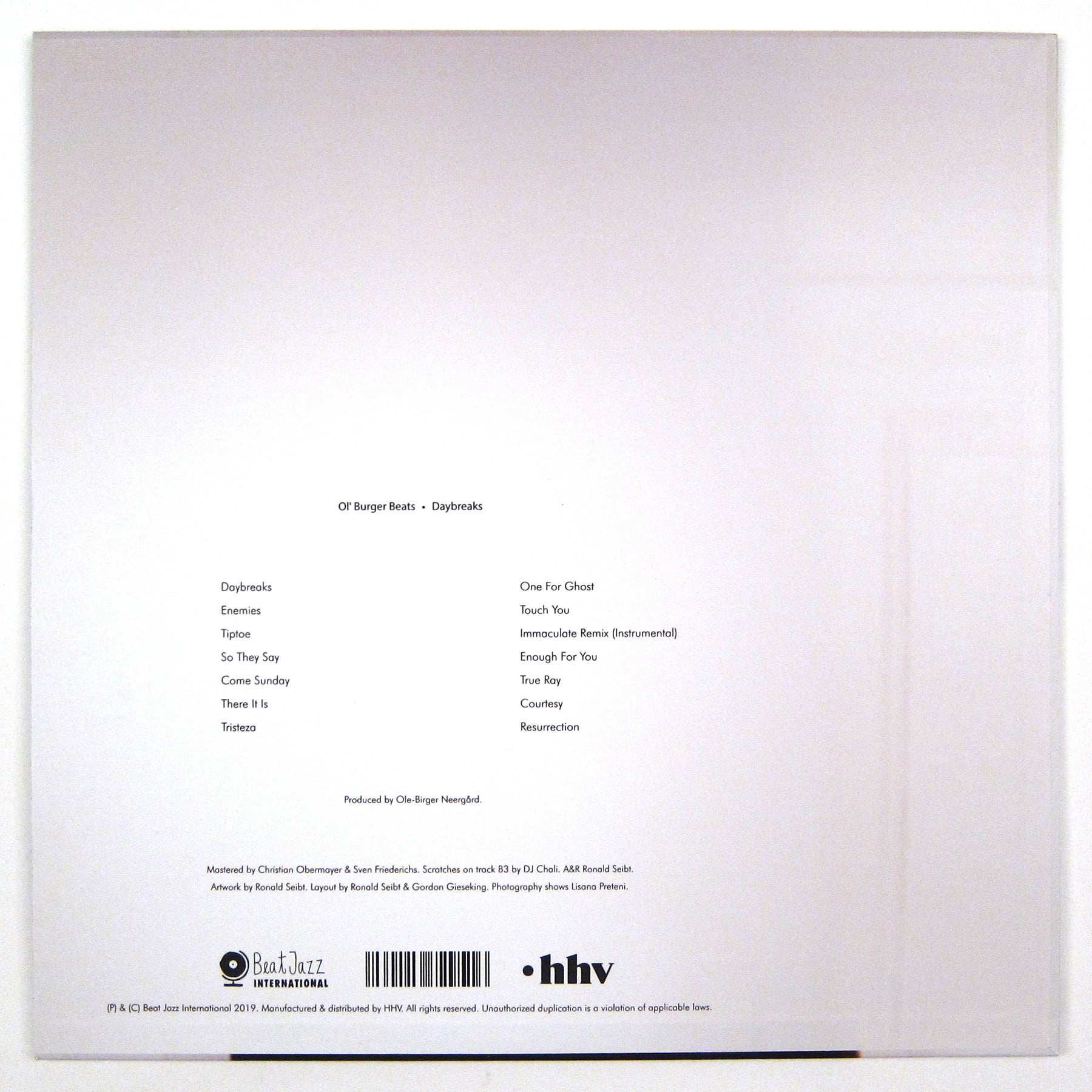Ol' Burger Beats (egentlig Ole-Birger Neergård) er en norsk hip-hop-produsent, DJ og platesamler fra Vatne i Haram kommune. Ahem, Excuse me, let’s start again. Ol’ Burger Beats is the alias of Ole-Birger Neergård, a Norwegian hip-hop producer, DJ and record collector that hails from Vatne, Norway. He is best known for his 2014 LP High Rhodes, which earned him accolades from the like of Mass Appeal and Okayplayer, and comparisons to the like of Pete Rock and J. Dilla. His 2017 Sophomore LP Mind Games included features from Chester Watson, Quelle Chris, and Jeremiah Jae. “Daybreaks” is the fourth installment in a series by Berlin label Beat Jazz International titled Beats, Jazz, and Vinyl, and is a showcase of mostly instrumental works by various artists that inhabit the crossover between hip-hop and jazz. “Enemies” sets the tone neatly with sampled soul vocals, guitar hammer-ons, and a dusty backbeat. “So They Say” fits into the “Lo-fi Beats” genre, slo-mo chrords with snatches of vocal. The disc ends with “Resurrection”, fierce sub-bass and a delicate piano riff. This record comes in a heavyweight "tip on" style jacket and is pressed on standard black vinyl.