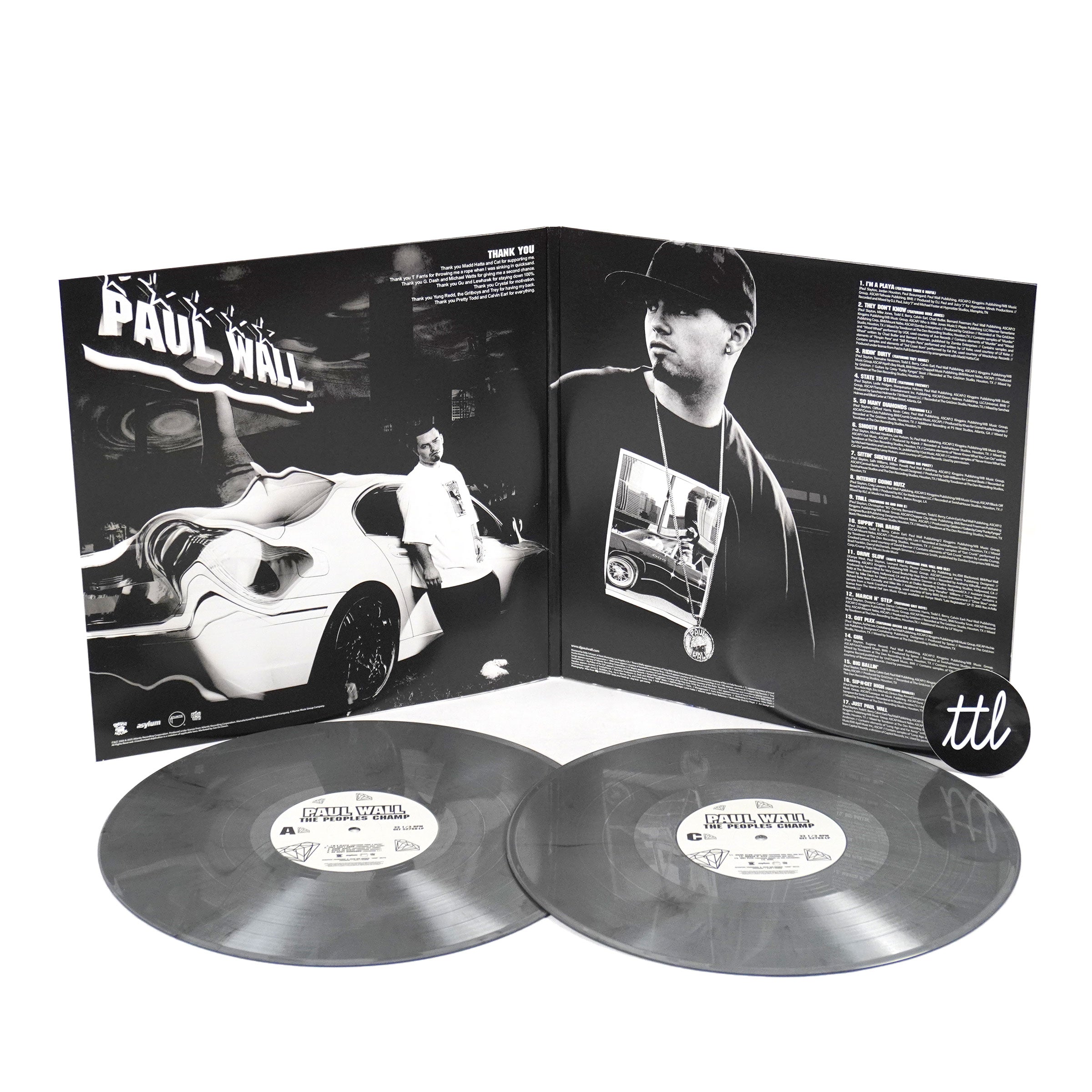 "The People's Champ, featuring Paul Wall's famous platinum and diamond grillz on the cover, was released on September 13, 2005, debuting at #1 on the Billboard Charts. The album is an ode to the laid-back Houston culture of hustling, cars, sippin' on purple drank while listening to Chopped and Screwed music. The album had the internet goin' nuts with features from Texas contemporaries Mike Jones, Big Pokey, Bun B, as well as southern rap stars Three 6 Mafia, T.I., and Lil Wayne. The album spawned another gold single from the Kanye West-produced track 'Drive Slow' and would push sales to Platinum status. Out of print on vinyl since it was released 20 years ago, Get On Down is proud to present a limited edition pressing of The People's Champ on Silver Smoke colored vinyl for the 20th Anniversary." - Get On Down