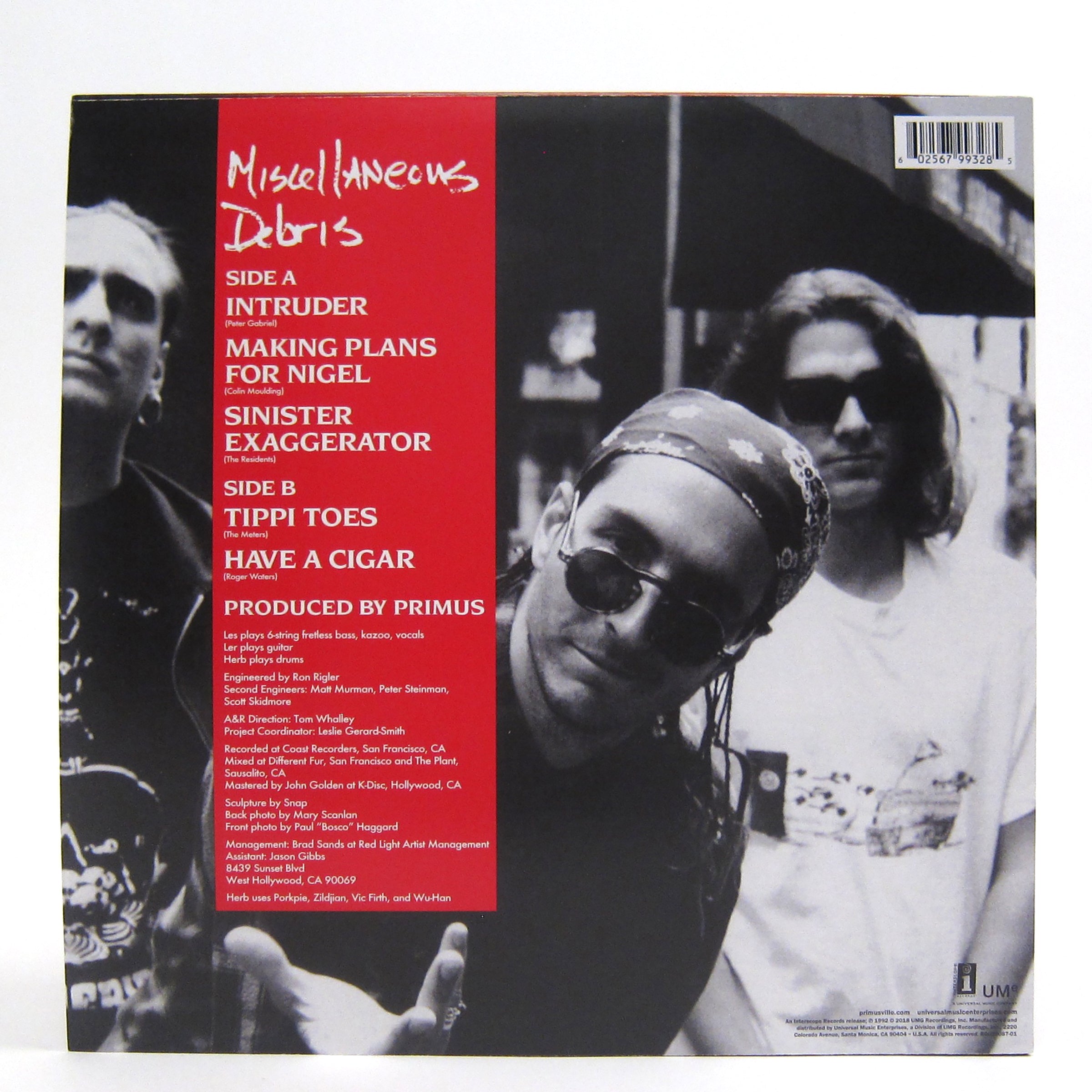 Primus Sucks! Following 1991's Sailing The Seas Of Cheese, Primus released the Miscellaneous Debris EP collecting five cover songs by bands which, in hindsight, sorta serve as a roadmap to the Primus sound: Pink Floyd ("Have A Cigar"), XTC ("Making Plans For Nigel), Residents ("Sinister Exaggerator"), Peter Gabriel ("Intruder") and The Meters ("Tippi Toes"). The EP was released on CD and cassette but never available on vinyl, until now.