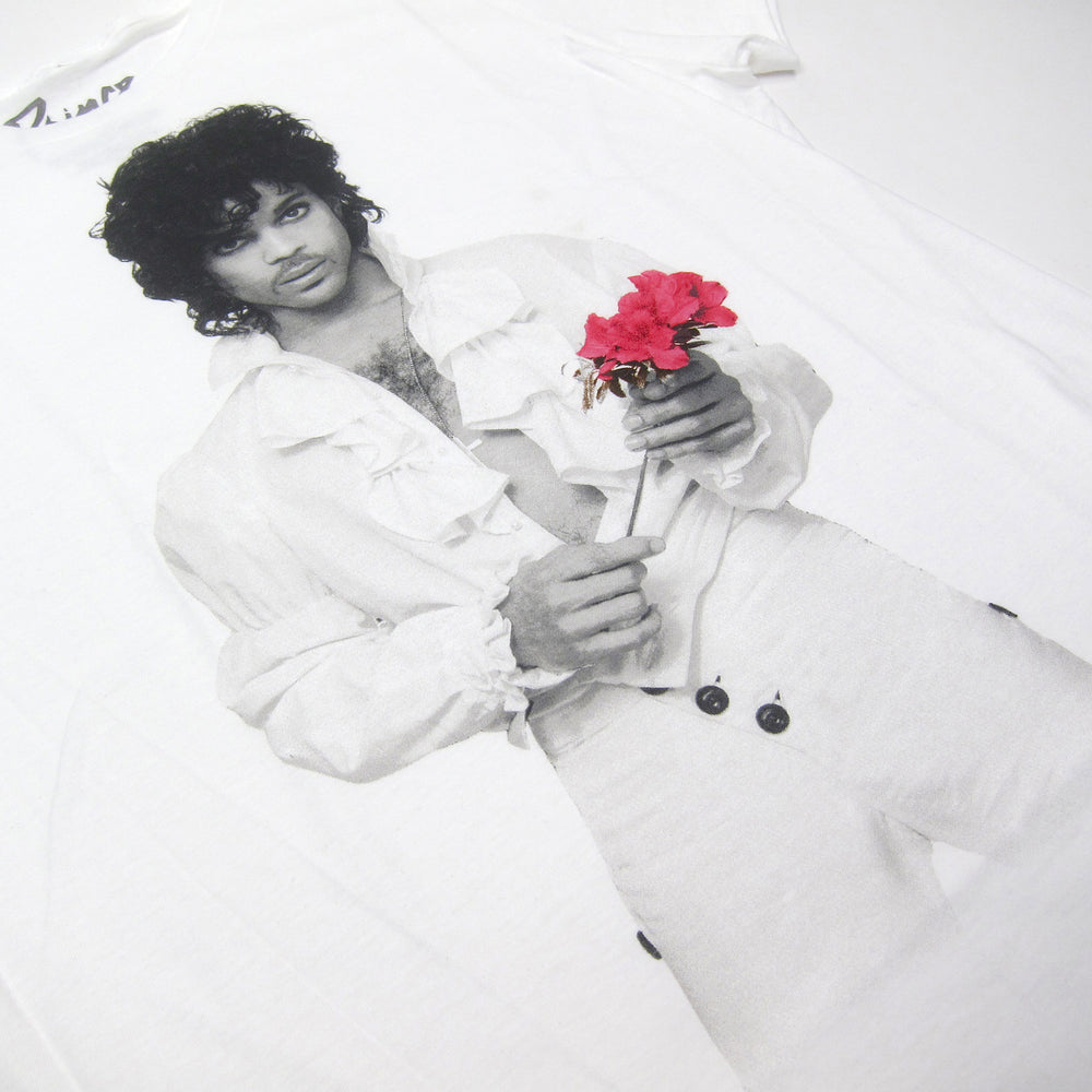 This shirt is everything. A black-and-white image of Prince holding a pink/red flower printed on a 100% cotton t-shirt… pure bliss. The photo is believed to have been taken on stage in Paris circa 1985, and be warned: if you wear this out, people will look at you AND try to talk to you.