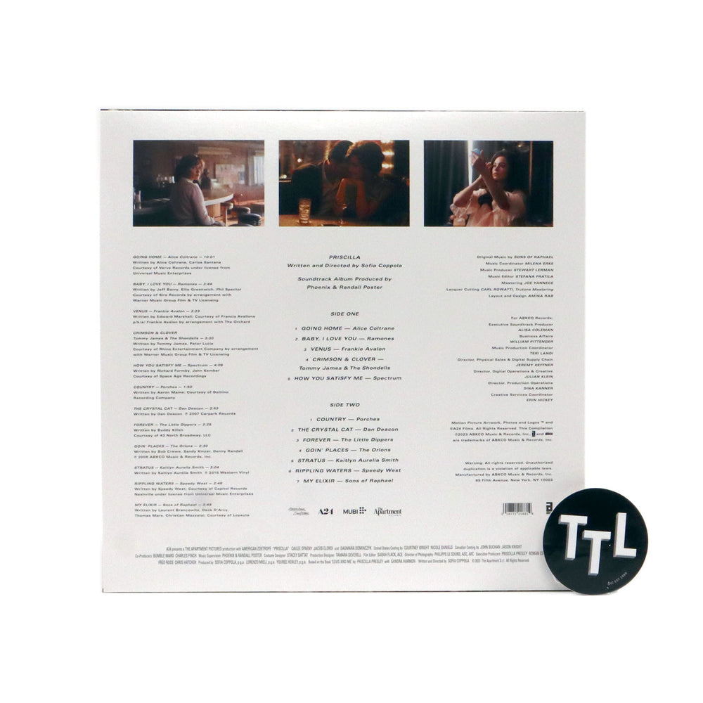 "The soundtrack for Sofia Coppola’s latest feature film Priscilla, based on Priscilla Presley’s memoir Elvis and Me, is now available. This eclectic soundtrack is both a reflection of the times chronicled in the film and underscores the personalities who portray the most famous married couple in 20th century American history. Features tracks by Ramones, Tommy James & The Shondells, Alice Coltrane, and an instrumental orchestral cover by Sons Of Raphael of Phoenix’s song 'My Elixir.'" - ABKCO