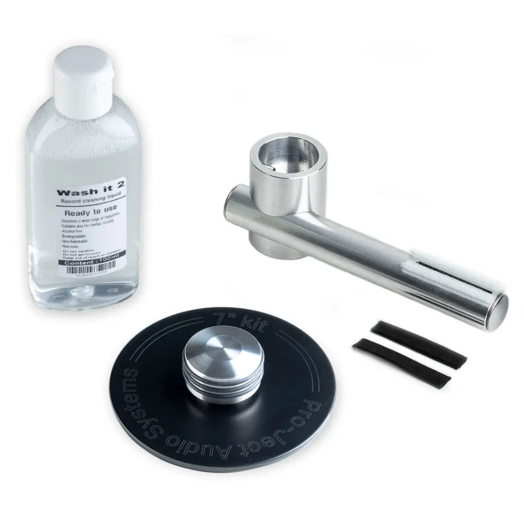 "This long-awaited add-on for cleaning 7” records on VC-E will help to recondition your valuable vinyl. Whereas the standard record clamp and vacuum arm are perfect for 12 inches, this 7” kit fulfills your needs for 7” singles. A dedicated clamp and a vacuum arm that gives full vacuum power is included as well as a spare bottle of 100ml Wash it 2 cleaning concentrate." - Pro-Ject