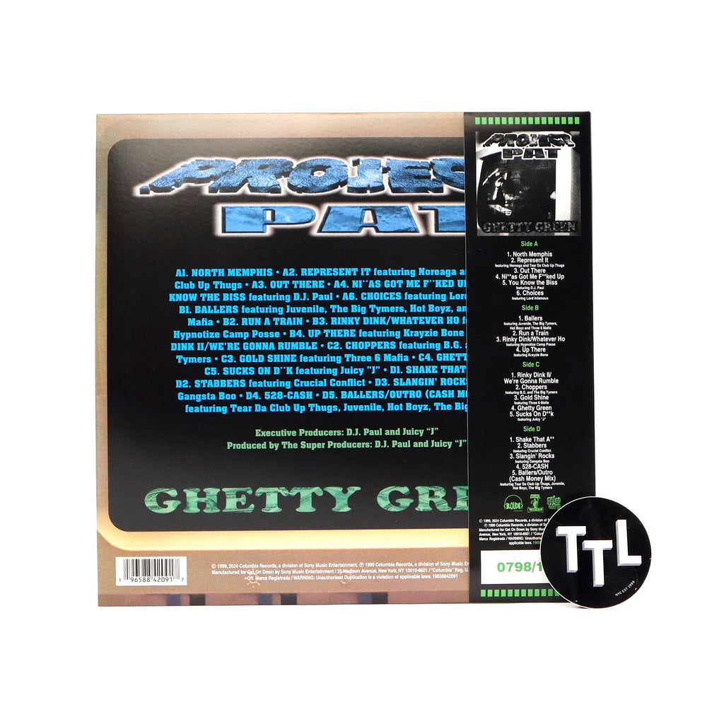 "After The Kaze (Project Pat's first group) released Kamakazie Timez Up in 1998, the Memphis rap legend and Three 6 Mafia affiliate launched his solo career by dropping his major label debut album Ghetty Green in 1999 on Hypnotize Minds/Loud Records. Produced by DJ Paul and Juicy J, Project Pat raps in his signature triplet flow over southern 808-backed beats sprinkled with soulful samples alongside Three 6 Mafia members with appearances by Cash Money's Big Tymers and Hot Boyz, Noreaga, Krayzie Bone, and Crucial Conflict. Previously only released on CD and cassette, Get On Down in partnership with Sony Music's CERTIFIED is proud to present for the first time on vinyl a limited edition pressing of Ghetty Green. Pressed on Aqua Blue and Mint Green double-colored vinyl in a gatefold jacket and OBI." - Get On Down