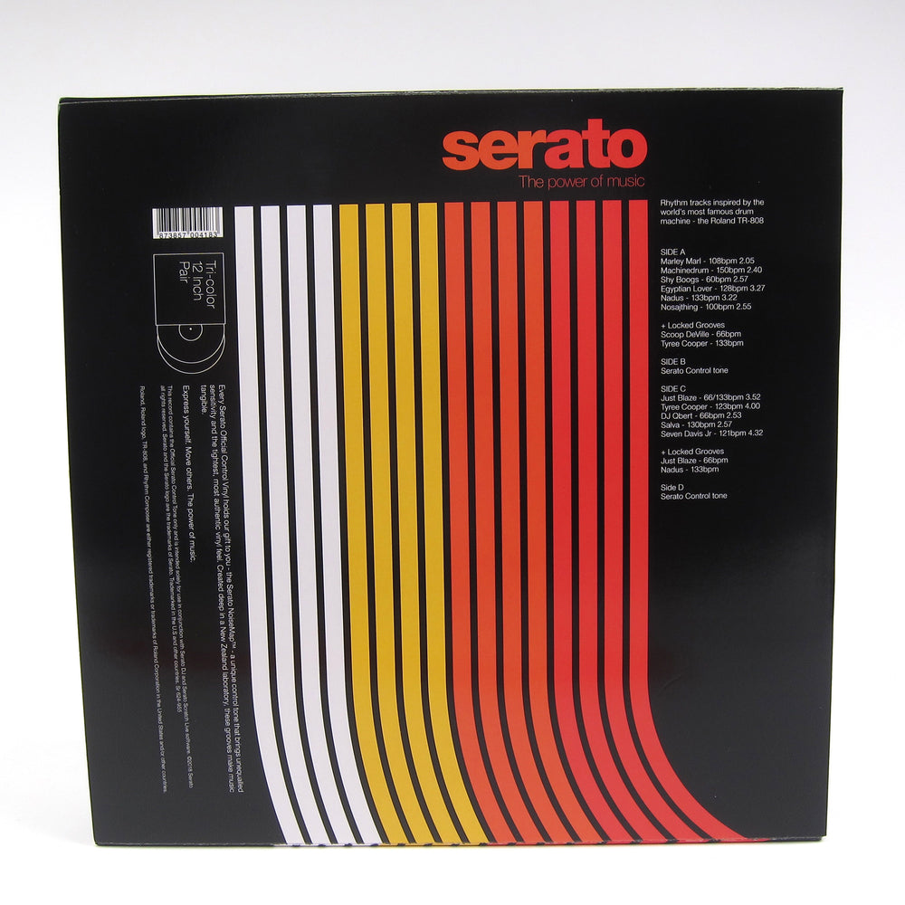 Hit 'em with the 808. The most iconic drum machine in history gets its own Serato Pressing! Roland has teamed up with Serato for this very special control vinyl set that pays tribute to the legendary TR-808. Not only is the vinyl pressed up in a custom triple colorway (yellow, orange, and red of course, to match the 808's buttons), but two sides contain exclusive rhythms and locked grooves by an all-star list of producers. Eleven 808-inspired beats and four locked grooves total coming at you via 808 pros like Just Blaze, Egyptian Lover, Marley Marl, Qbert, Nosajthing, Tyree Cooper, and more. Strictly limited edition, don't sleep!