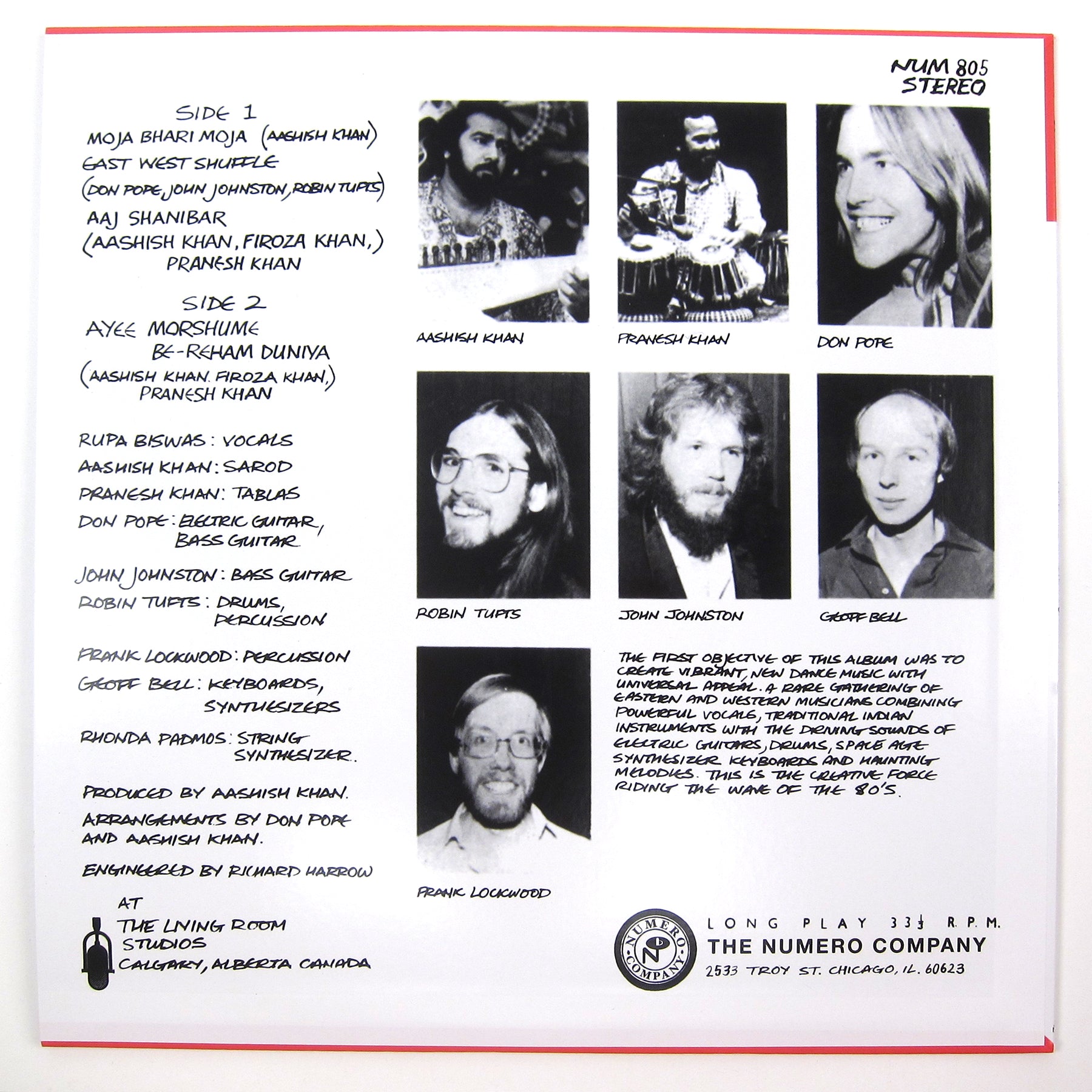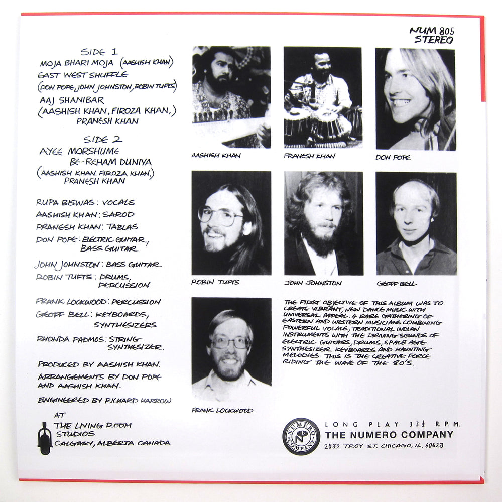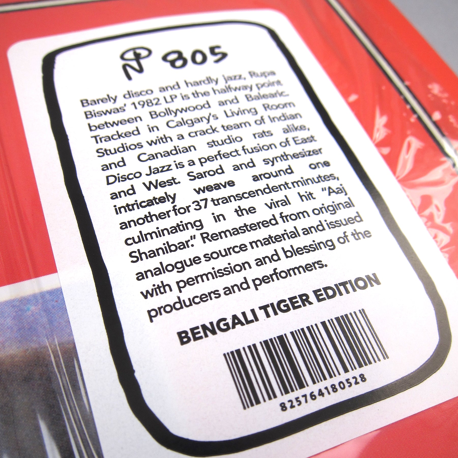 official reissue of highly sought after '82 Indian disco/fusion, limited color variant! This fiendishly elusive and addicting LP has been harder and harder to come by as original copies have topped out at upwards of $750 USD. Thanks to the power of the algorithm, the album (and specifically the track "Aaj Shanibar") reached a wider audience, pushing the demand for the LP - and thus a proper reissue - through the roof. While not straight disco, and certainly not jazz, Rupa Biswas' sole release from 1982 creates the perfect fusion platter: East meets West, synthesizer and guitars meet sarod, and Bollywood meets Balearic to create four brilliant cuts of musical genius. Recorded at Living Room Studios in Calgary by a "crack team" of Indian and Canadian studio cats, Rupa and the production crew groove through the tracks like a hot knife through butter. The opener, "Moja Bhari Moja" locks us in with the funky baseline and rhythm guitar before Rupa's vocal's steal the show. "East West Shuffle" sounds like a straight up ESG or Liquid Liquid cut, a sure-shot foot-stomper. The song most people may know is, as mentioned before, "Aaj Shanibar", which closes out the A-side. It's a beautiful cinematic sunset disco tune, a "cosmic disco killer" that'll be stuck in your head for months (in only the best way possible). Stretching itself over the whole of the B-side is "Ayee Morshume", the kind of cosmic disco that grooves through endless solos and mesmerizing vocals. This official reissue is remastered from the original analog source material with the permission and blessing of the producers + performers, pressed on 'Bengali Tiger' orange and black colored vinyl, limited edition, recommended!