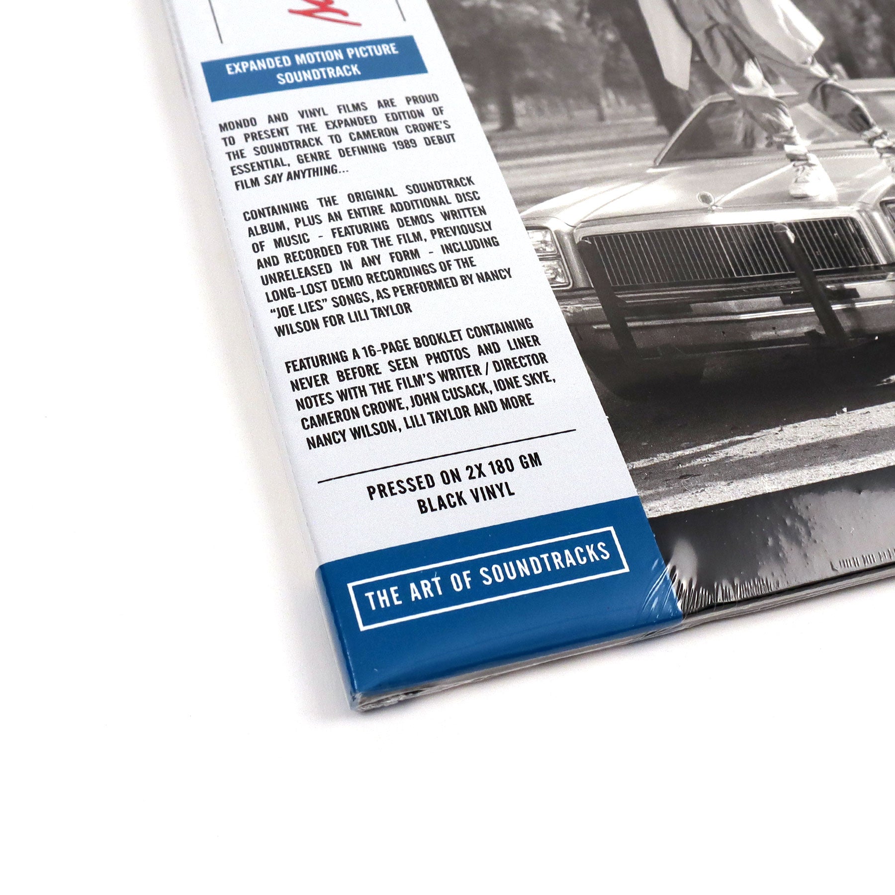 "Mondo and Vinyl Films are proud to present the premiere, expanded edition of the soundtrack to Cameron Crowe’s essential, genre-defining 1989 debut film SAY ANYTHING… Containing the original soundtrack album, plus an entire additional disc of music – featuring demos written and recorded for the film, previously unreleased in any form – including long-lost demo recordings of the 'Joe Lies' songs, as performed by Nancy Wilson for Lili Taylor. Featuring a 16-page booklet, containing never-before-seen photos and liner notes with the film’s writer and director Cameron Crowe, stars John Cusack, Ione Skye, Lili Taylor and composer Nancy Wilson and more!" - Mondo