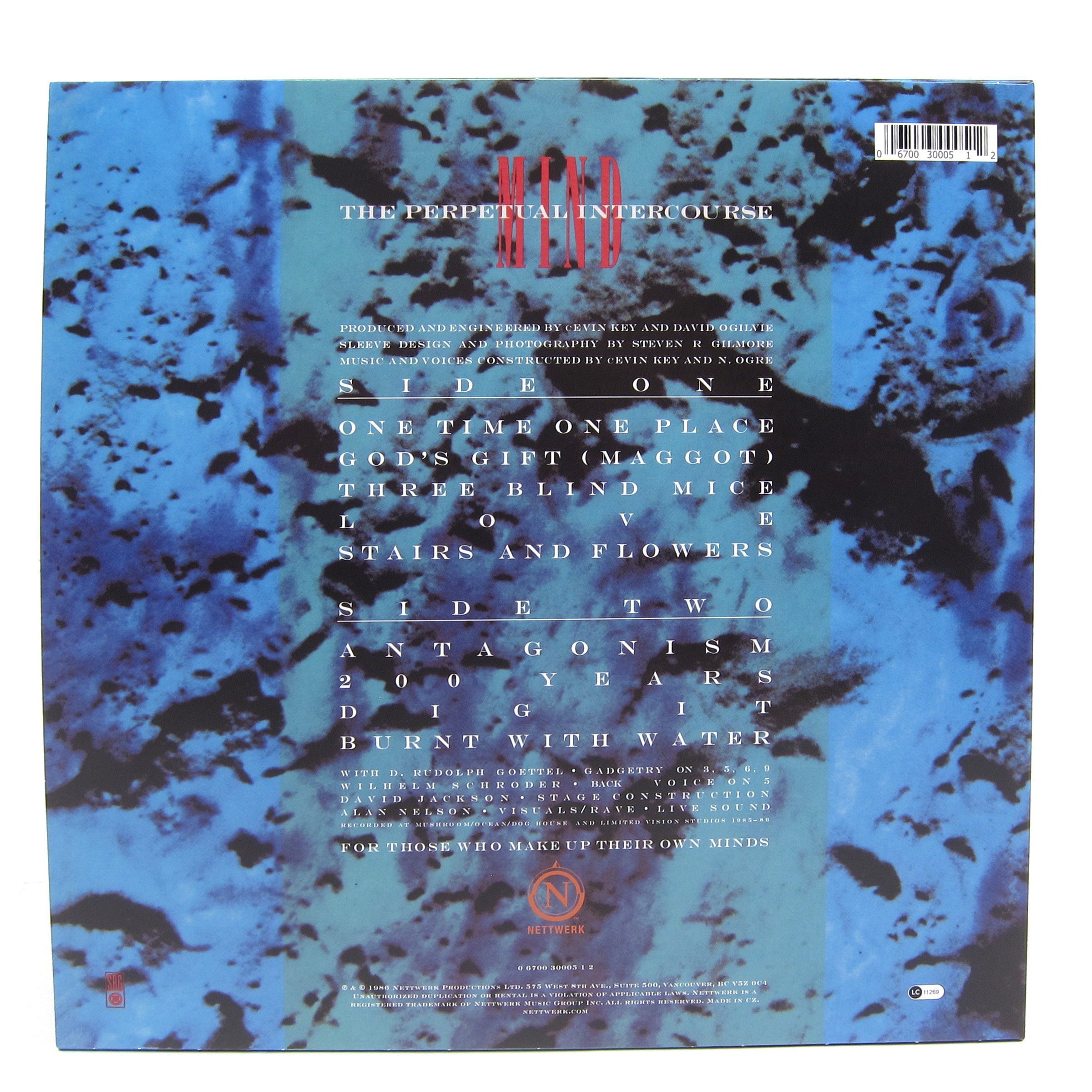 Sophomore studio album from Vancouver's Skinny Puppy. Mind: The Perpetual Intercourse was originally recorded in 1986 and garnered the band plenty of attention. From the cover art sourced from a pornographic film (much to the ire of Tipper Gore and the Parents Music Resource Center) to the heavy rotation of "Dig It" on MTV, the band was in the public eye. The departure of Bill Leeb to pursue Front Line Assembly allowed for the addition of Dwayne Goettel. Goettel made a noticeable impact on Skinny Puppy's production value, bringing a deep knowledge of equipment and sampling to the group. There's a welcome amount of experimentation in songs like "Stairs And Flowers" and "Gods Gift (Maggot)." Although Mind: The Perpetual Intercourse may not be the band's best work, it's an essential step in the development of their sound. Nine tracks in all. Released by Nettwerk Music Group on black vinyl housed in a full color sleeve.