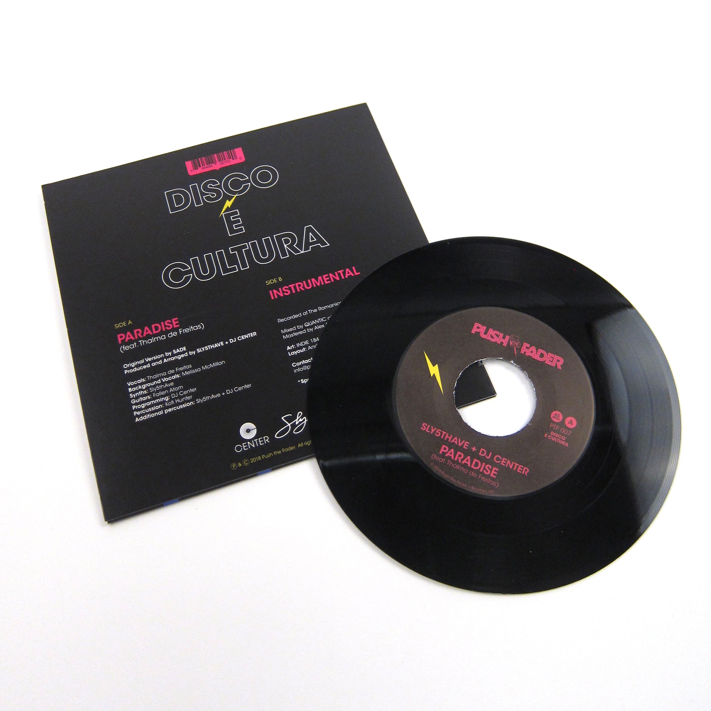 DJ Center and Sly5thAve share a love of two key things. The first is the percussive-heavy "samba-jazz" of Brazil, characterized by artists such as Jorge Ben, Milton Banana Trio and Arthur Verocai, among the plethora of possible examples I could provide. The second is the timeless, transcendental songs of Queen Sade Adu. This shared love comes across swimmingly in this cosmic dance floor soul session of a 7". Presented here is a sweet cover of the Sade classic "Paradise" replete with killer keys by Sly5thAve, production by DJ Center, and mixing by Quantic. Lest we forget the astounding vocals by Thalmia De Freitas which both live up to and pays homage to the classic Sade original, making you long for a place that could only be found in paradise. It's a thumping tropical rhythm that'll have the dance floor vibing hard. Heads will turn. The flip side features the blissed-out instrumental track. Original artwork is blessed by the amazing Indie 184 and put out by Push The Fader. Recommended, this won't last long.