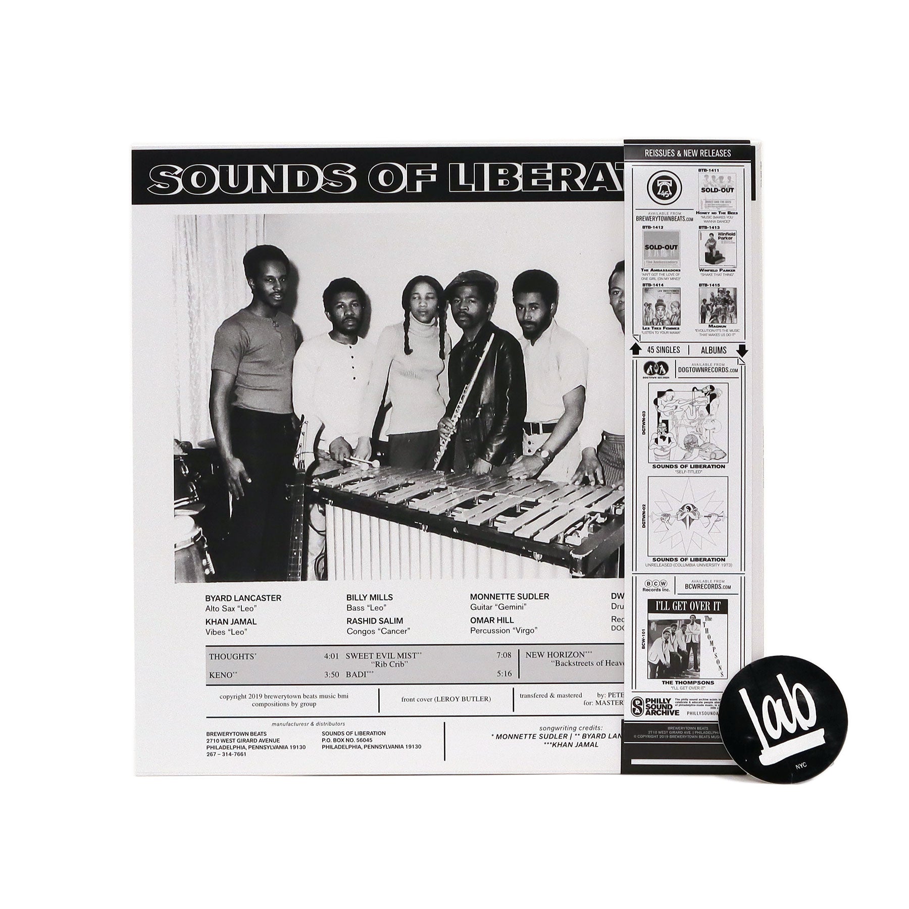 "Sounds Of Liberation was a band – and a social movement – formed in 1970 out of the Germantown & Mt Airy neighborhoods of Philadelphia. The band consisted of seven members: Khan Jamal (vibraphone), Byard Lancaster (alto saxophone), Billy Mills (bass), Dwight James (drums), Monnette Sudler (guitar), Omar Hill (percussion), William Brister (percussionist, aka Rashid Salim). The group issued one self-released album, New Horizons – alternately titled The Sounds Of Liberation in later pressings – in 1972, on their Dogtown label. In addition to club performances, the collective initiated happenings in elementary schools, prisons & community centers throughout Philadelphia, to great success and impact in the city’s African-American and jazz community. By 1973 the band – along with their manager, George Gilmore – travelled to New York City for a recording session at Columbia University. This five-song session of original music (with compositions penned by Jamal, Lancaster and Sudler) has never been released and has been prepared for this important and long-overdue LP package by group members, in collaboration with Brewerytown Beats Records in Philadelphia." - Brewerytown Beats