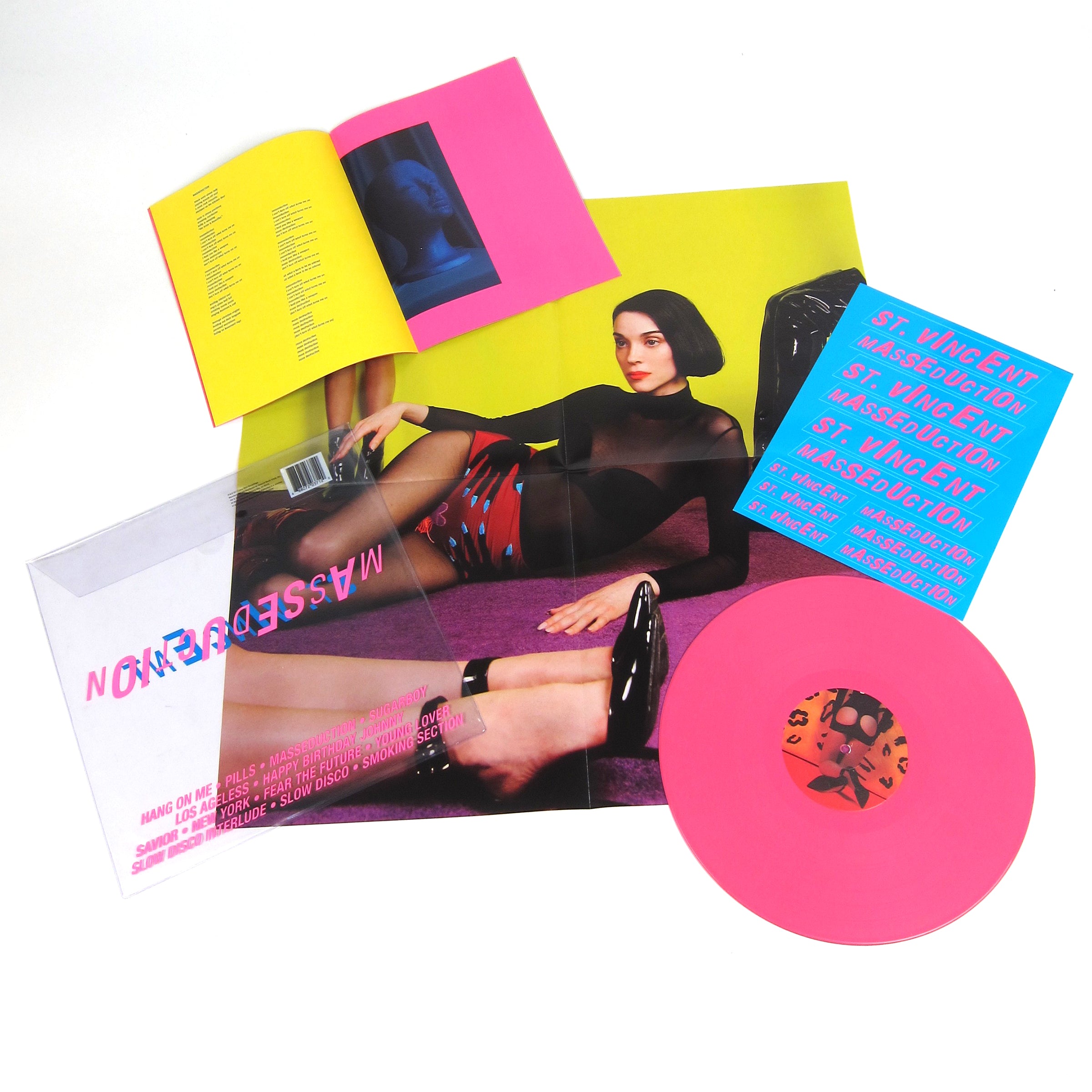 "You can't fact-check it, but if you want to know about my life, listen to this record." Annie Clark aka St. Vincent's 5th album, Masseduction (read "Mass Seduction," not "Mass Education), is about love, she says. The New York-based musician worked with producer Jack Antonoff for the 13-tracker, and there are plenty of clues as to the first-person nature of the release: the lead single, "New York," which contains lyrics like "You're the only motherfucker in the city who can handle me," is very widely gossiped (the media loves covering Clark) to be about her ex, Cara Delevingne, and another song, "Pills," even features the model/actress singing the hook (also, in an interview, Clark mentions "I was trying to get through pharmaceutically."). On the music side, it's guitar, piano, synth, strings, and "drum beats that punch with purpose" (courtesy of Soundwave) that set the mood, and she also enlists help from Thomas Bartlett (piano), Kamasi Washington (saxophone)," and Jenny Lewis (vocals) to complete a sexy, chic rock backdrop also informed by new wave, ambient, and pop. If 2013 self-titled LP leaned toward the experimental, this album is certainly more accessible, but the shift happens without Clark losing any of the cheeky, chic edge that seems and sounds so naturally ingrained in her. This is the deluxe version of Masseduction, which is printed on limited-edition opaque pink vinyl and includes: translucent PVC sleeve, 24" x 24" foldout poster, sticker sheet, and a 28-page booklet.
