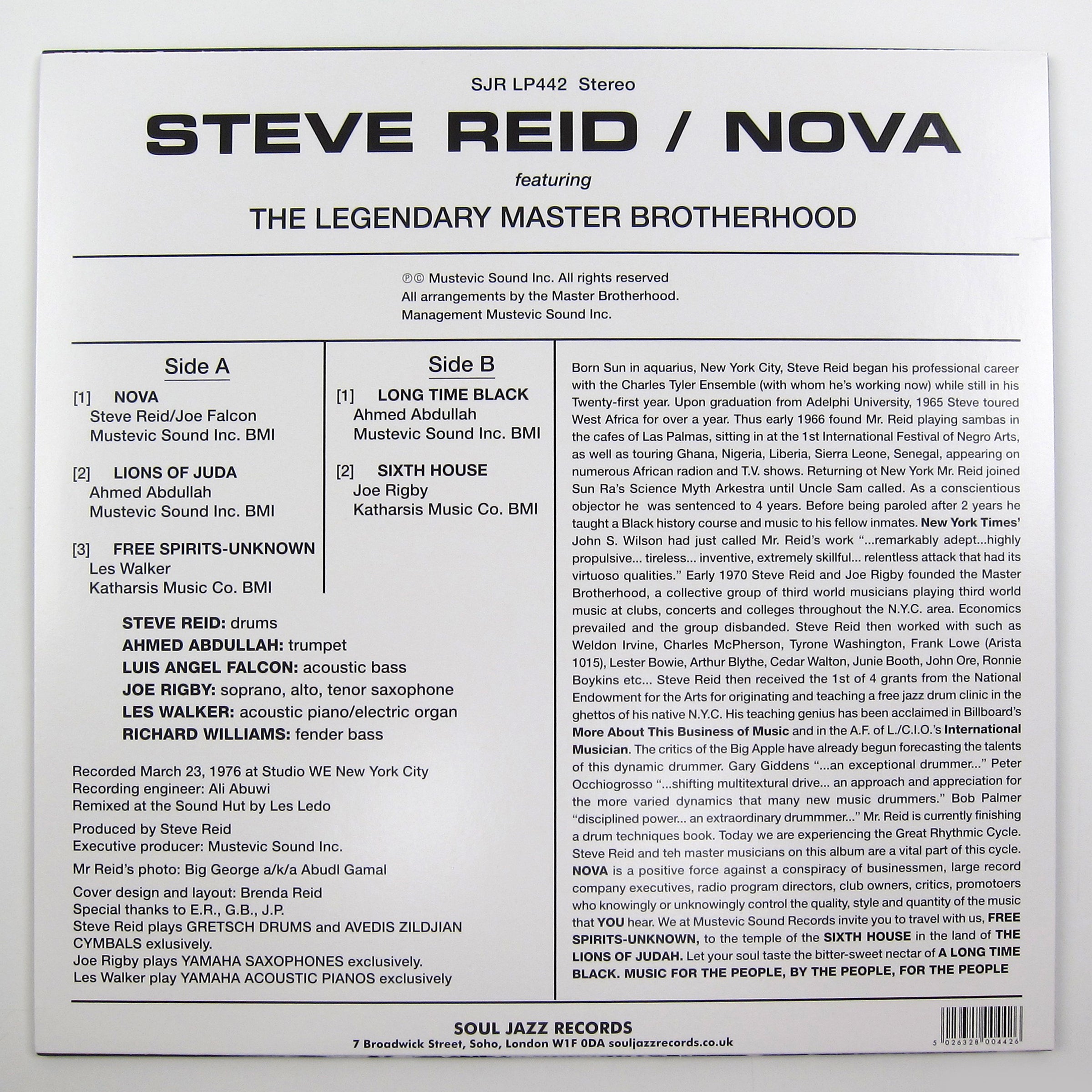 • Breathtaking debut from prolific drummer. Regarded as one of the greatest drummers to ever lay it down (according to collaborator Kieran Hebden - Four Tet - as well as Gilles Peterson), Nova is the debut album from New York born-and-bred drummer Steve Reid. Reid's career began when he was just 14, playing as a drummer at Motown for Martha and The Vandellas' "Heatwave". Growing up, he played in the house band at the Apollo Theatre backing James Brown, lived next to Coltrane, and worked in a department store with Ornette. He went onto play with an extraordinary cast of artists, a who's who of the greats, including Miles Davis, Sun Ra, Fela Kuti, Ornette Coleman, Lester Bowie, Jackie McLean, Archie Shepp, Gary Bartz, Horace Silver, and Dee Dee Bridgewater, among a host of others.