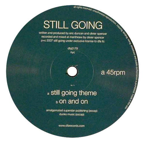 DFA debut for the duo Still Going aka Eric Duncan from Rub N Tug and Olivier Spencer of House of House, Manthraxx and Kitsune fame. If you recognize those names, you're probably anxious over the prospects here, what cosmic territories will this lead to? "Still Going On" is a continuation of their underground hit "Still Going On Theme" which is to featured on Prins Thomas BBC Radio 1 Essential Mix. "Still" and the b-side "On And On" both have that hypnotic effect, as they continually hammer down basic, repetitive, catchy elements until you're sweating and your eyes are rolling into the back of your skull.