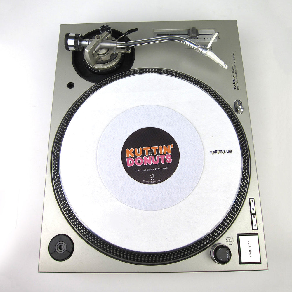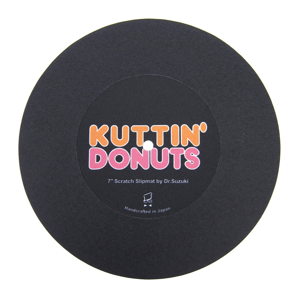 Another slipmat innovation from the one and only Dr. Suzuki! This time the good doctor has all you 45 DJs in mind with the all new Kuttin Donuts slipmat. Featuring ultra thin construction, these mats are designed to have the record sit as flat for the best possible performance and to lessen wobble/warp issues. With the popularity of 7" scratching growing stronger daily, this performance slipmat couldn't have come at a better time.