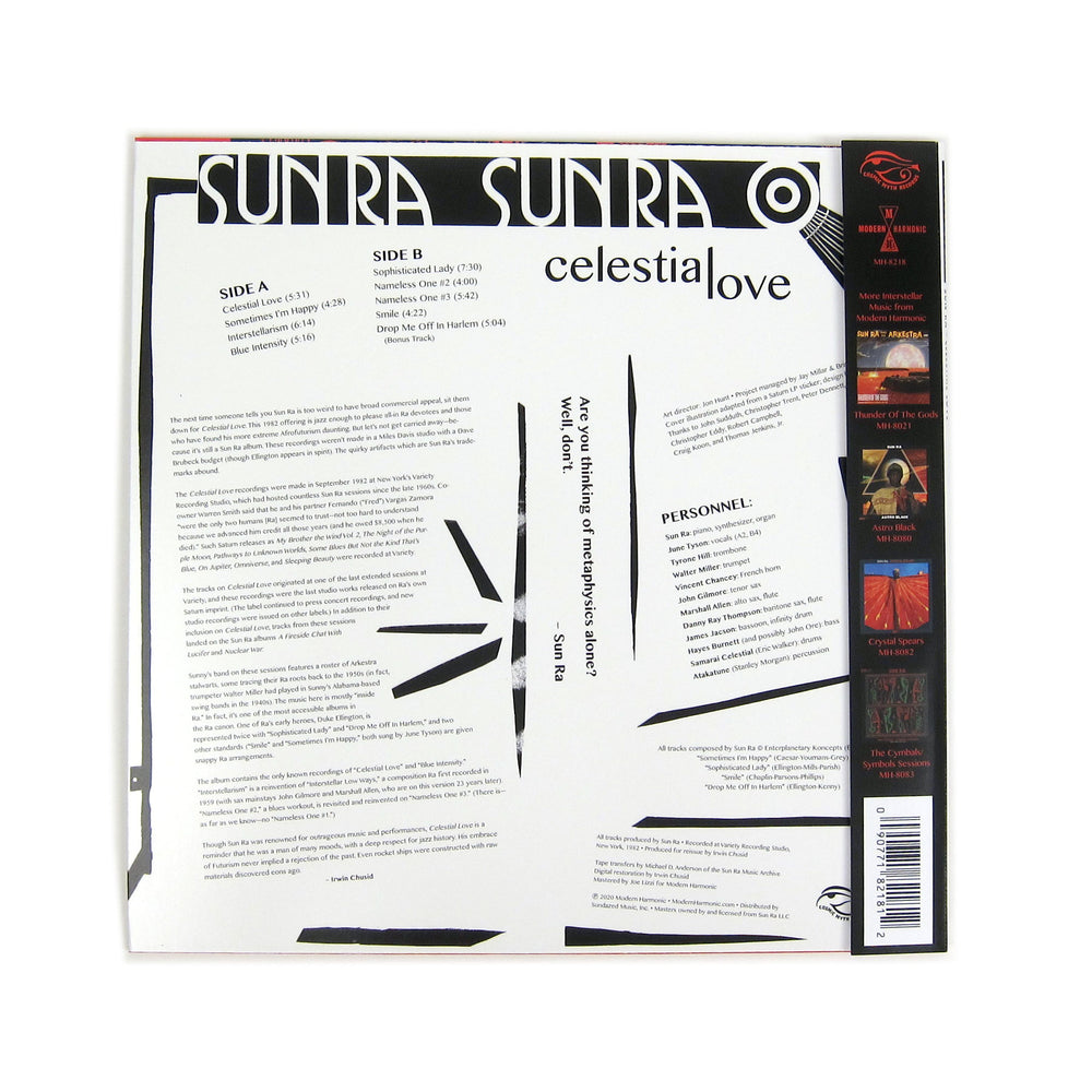"True studio albums of Ra with the Arkestra are rare on this planet or beyond. This studio saucer is an interplanetary interpreter, here to convert even the faintest of heart to the sounds of Sun Ra. Recorded with Arkestra veterans at the same NY studio that hosted countless Sun Ra sessions since the late 60s, this first ever reissue of Celestial Love contains the only known recordings of the titular track and “Blue Intensity,” plus a cut not on the original Saturn LP! The music here is mostly "inside Ra." In fact, it's one of the most accessible albums in the Ra canon. One of Ra's early heroes, Duke Ellington, is represented twice with "Sophisticated Lady" and "Drop Me Off In Harlem," and two other standards ("Smile" and "Sometimes I'm Happy," both sung by June Tyson) are given snappy Ra arrangements. Though Sun Ra was renowned for outrageous music and performances, Celestial Love is a reminder that he was a man of many moods, with a deep respect for jazz history. His embrace of Futurism never implied a rejection of the past. Even rocket ships were constructed with raw materials discovered eons ago." - Modern Harmonic