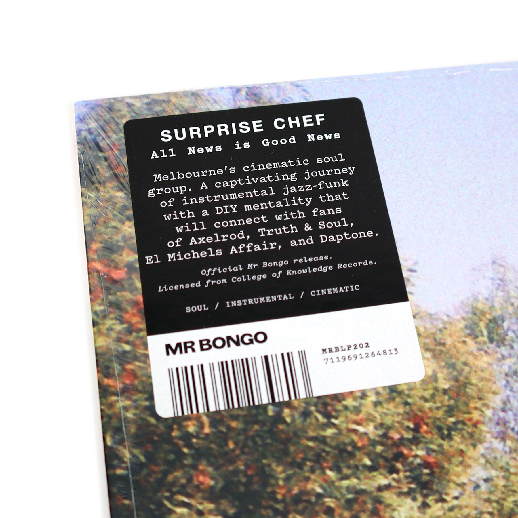 "There is something simultaneously both brand-new and retro about All News Is Good News - the debut album from Melbourne's instrumental soul group Surprise Chef. It sounds like something dreamt up by lo-fi cousins of David Axelrod and Janko Nilovic, with dramatic Library-music-eqsue cinematic arrangements echoing both light and dark, delving into moments of dissonance and positivity. There is a meticulous education of 1970's soul on display that touches on the legacies of the great composer / producers, yet at the same time this is a truly contemporary record that could have only been made now. Formed at the end of 2017, Surprise Chef have grown within the fertile, creative, and supportive Melbourne music scene. Whilst the band is comprised of four core members, the album features friends and family as guest instrumentalists on flute, saxophone, vibraphone, congas, and assorted percussion; all adeptly recorded by engineer Henry Jenkins from the band Karate Boogaloo. The warm-raw-authenticity of the album was captured in the recordings live to tape over a handful of sessions in the band's home studio in Melbourne's inner-northern suburb of Coburg. As band member Lachlan Stuckey explains 'All of the music we record is tracked live to tape, simply because so many of the records we love most were made that way'. The results are a captivating journey of instrumental cinematic-soul that will connect with the hardened Axelrod, Truth & Soul, El Michels Affair, and Daptone's fans, as well as the open-minded first-time listener." - Mr Bongo