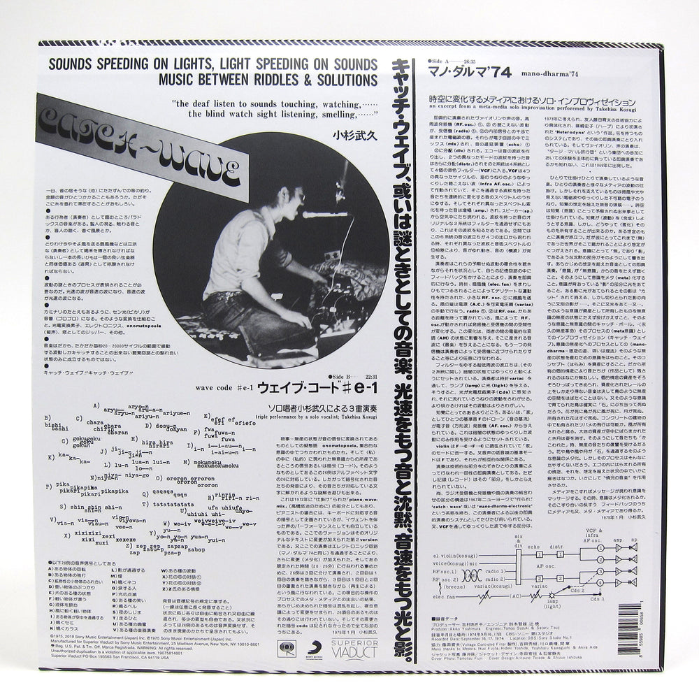 First-time official vinyl reissue of deep Japanese ambient debut. Takehisa Kosugi was a composer, multi-instrumentalist and mixed-media artist who was at the vanguard of Japanese avant-garde for decades. Founder of Japan's first improvisational music collective Group Ongaku in 1958 as well as the legendary Taj Mahal Travellers - an experimental Japanese collective that created spontaneously improvised drones - in 1969, Takehisa released his debut solo album Catch-Wave in 1975. Side-A's "Mano-Dharma '74" features improvised violin drones and voice combined with various oscillators, echo delays, an electric fan (say wha?) and layered tape experiments, while side-B's "Wave Code #E-1" is a three-part performance for a solo vocalist. The included (translated) liner notes are essential to understanding the meticulous process behind these performances, which on the rear cover are described as "Sounds speeding on lights, light speeding on sounds music between riddles & solutions." Also comes with a glossy 8.5" x 10" photo of Takehisa at the Mano Dharma concert in '74. Originals go for triple digits on the second hand market, so don't sleep on this killer reissue. Released by Superior Viaduct.