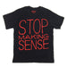 Logo for Talking Heads' legendary 1983 concert film Stop Making Sense, now in t-shirt form. Small black on black "TH" hit on bottom hem. Comes printed on all cotton, standard fit tees.