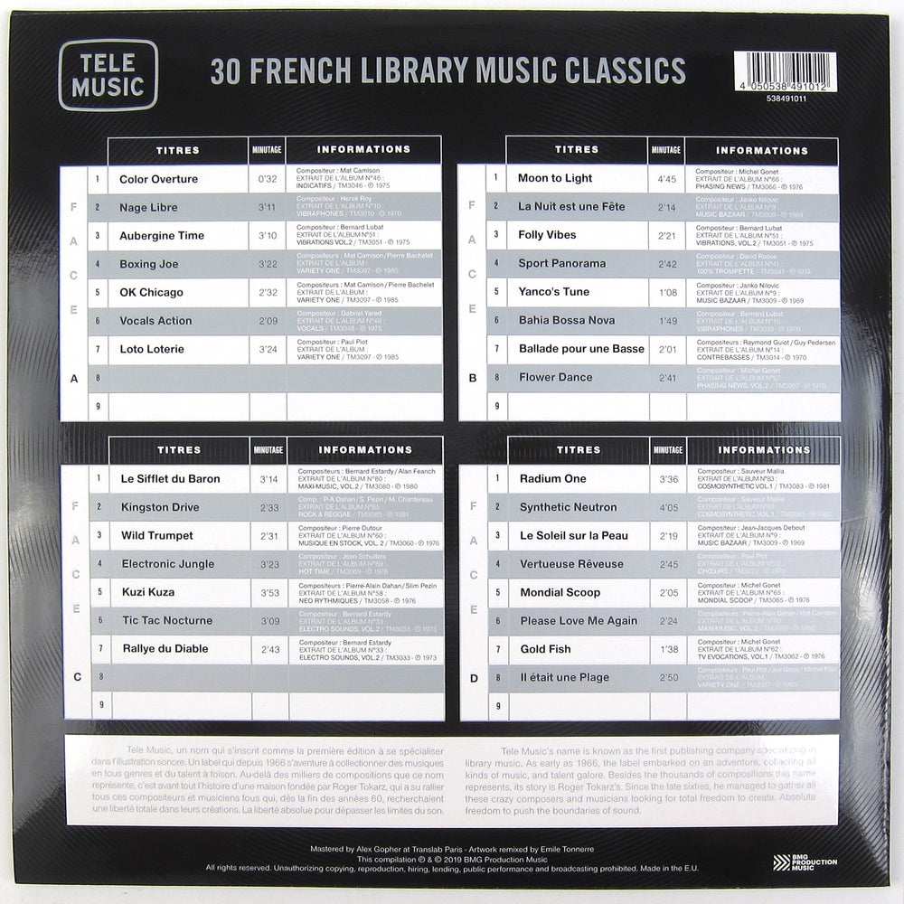 Killer selection of library music from Tele Music, the renowned (lol who am I kidding, there’s no such thing as renowned library music) French music house active in the 60s and 70s. Primarily situated in Europe, each of the major production companies (Bruton Music, De Wolfe, KPM being the most well known) are revered for their own unique sound, but Tele Music’s strength seems to lie in their versatility. This thorough survey of their catalog yields high-pedigree cues cut in an array of recognizable styles, anything from Miles Davis (“Sport Panorama”) to Pink Floyd (“Moon To Light”) to funky jazz flute (“La Nuit Est Une Fête”) to Kraftwerk (“Radium One”), each so good you’d be forgiven for mistaking any of them for major label album cuts. The second half of the comp moves into more modern electronic sounds, sometimes mixing them with organic woodwinds and percussion to sublime effect (“Rallye Du Diable,” “Mondial Scoop”). There’s also a fair bit of gentle female vocal accompaniment over rolling jazz grooves a la Cortex, Francoise Hardy (“Vertueuse Rêveuse,” “Le Soleil Sur la Peau”). No shortage of drama (not to mention incredible song titles, “Aubergine Time” anyone?) as all these tunes were cut in the hopes of catching the ear of some music supervisor for TV and film; there’s nothing low key or minimal to be found here. Unlike rare soul and jazz LPs which are often holding out in some geriatric collector’s attic, most - if not all - of these original library LPs were destroyed by their owners after a few years, so this is probably your only chance to get any of this stuff on wax. Don’t blow it!! Recommended.
