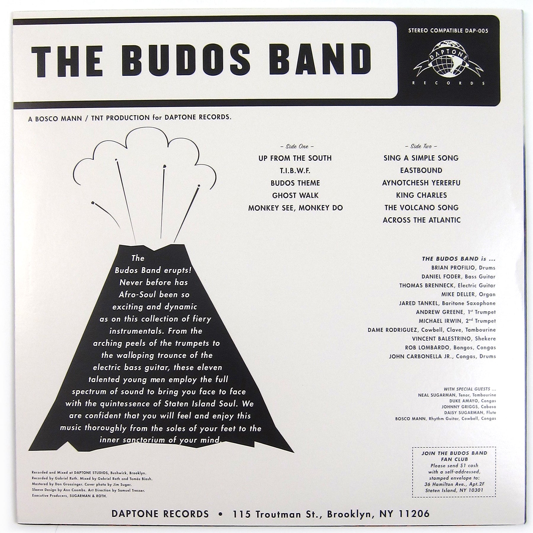 Debut album from the Staten Island instrumental soul group. The Budos Band sound is definitely leaning towards West African funk, but they do it with an emphasis on the funk more than the African. So there's no overt Fela tributes here or watered-down aping of "that sound," just tight instrumentals splashed with those synchronized low-tone horn blasts, clear rhythm guitar, and organ drones of death. Tracks range from the super mellow stuff like "Ghost Walk" (I like this style best) to horn jump-ups like "The Budos Theme" with most of it falling right in the middle. Their first single for Daptone had two of the real killers here, "TIBWF" and "Up From The South;" also check "Volcano Song" and their cover of "Sing A Simple Song."