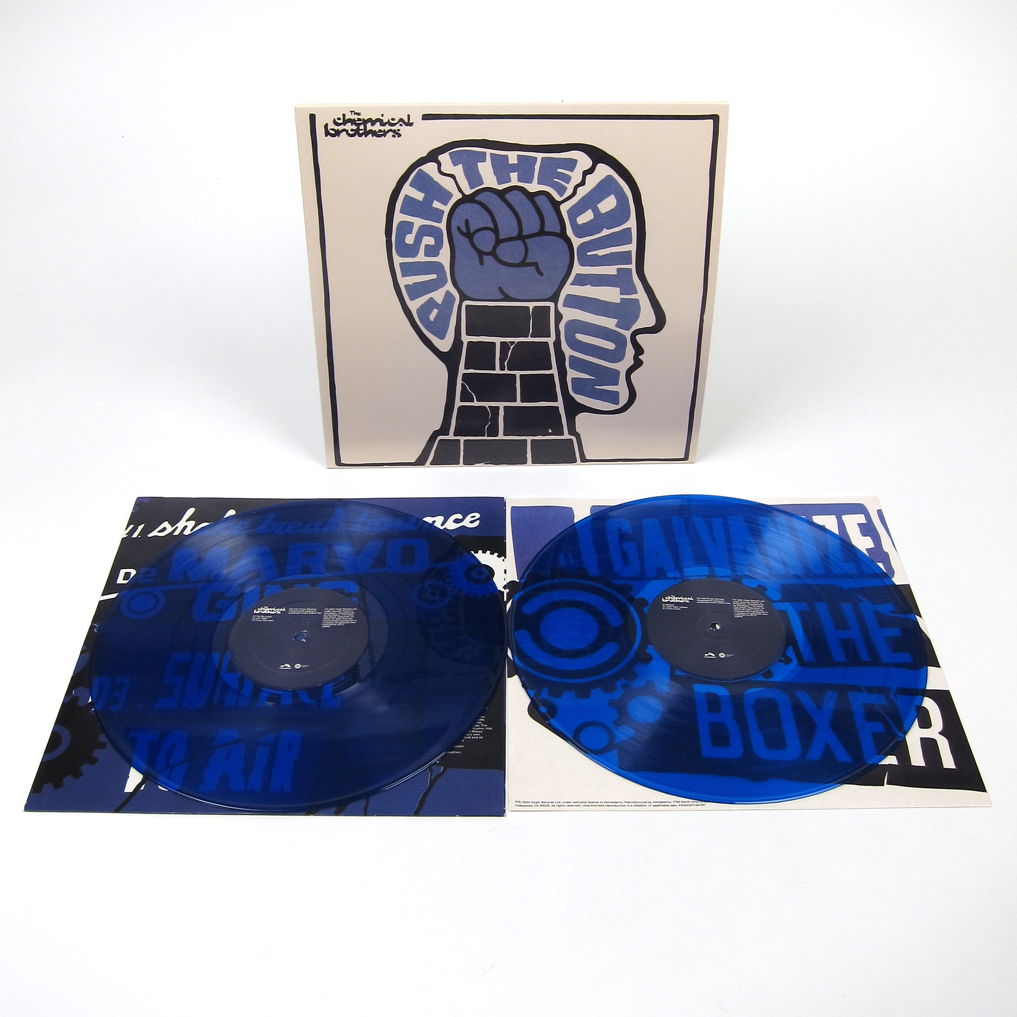 Fifth studio album from Manchester's The Chemical Brothers. Push The Button was originally recorded in 2004 and was the band's first Grammy winning album. There are guest spots galore, including contributions from Q-Tip ("Galvanize"), The Charlatans' Tim Burgess ("The Boxer"), Bloc Party's Kele Okereke ("Believe"), and Anwar Superstar ("Left Right"). Eleven tracks in all. Released by Astralwerks on hand numbered, limited edition blue vinyl housed in printed inner sleeves.
